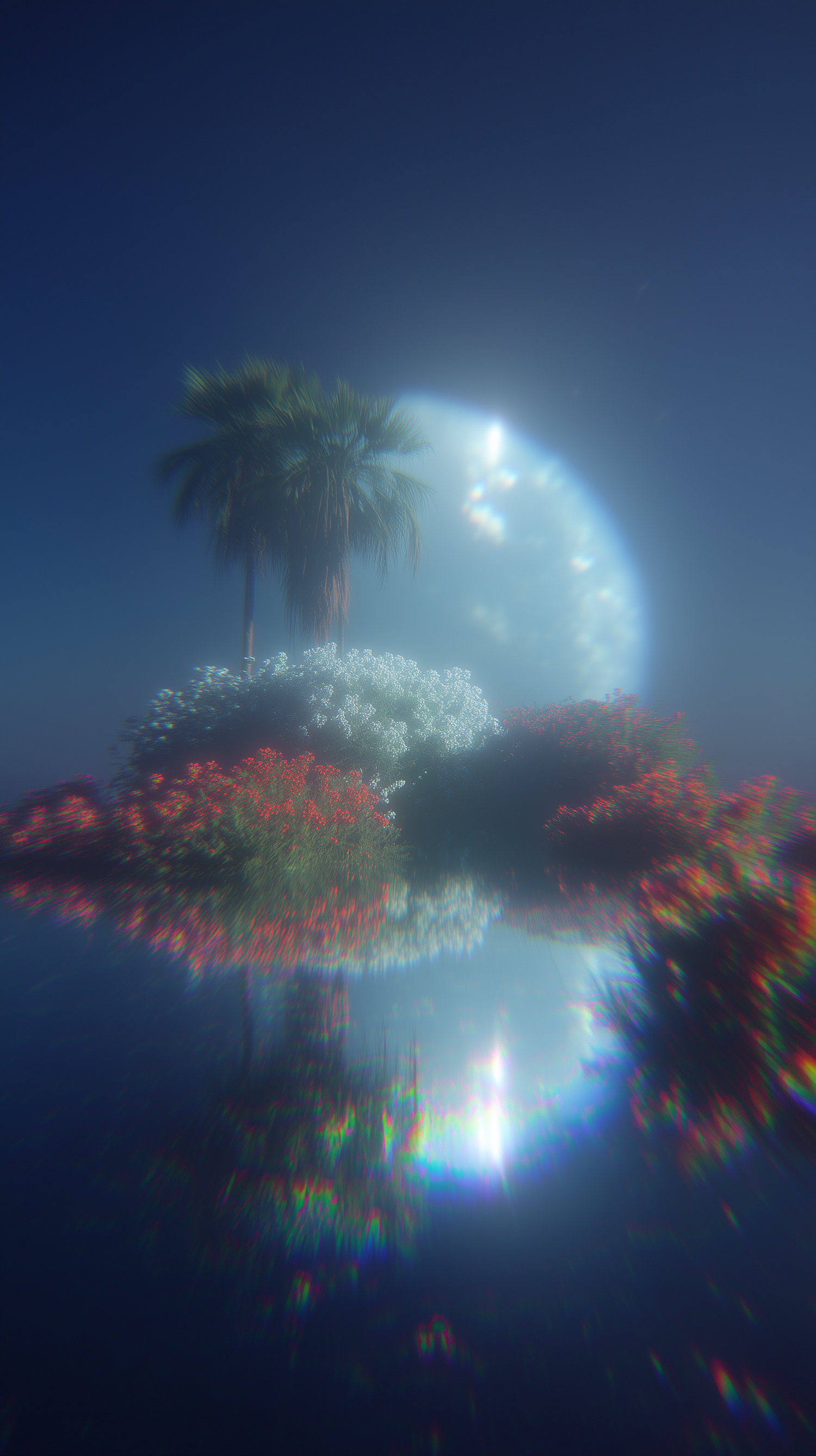 A dreamy island with vibrant flowers, a palm tree, and a glowing moon reflected in calm waters, creating a serene and surreal atmosphere.