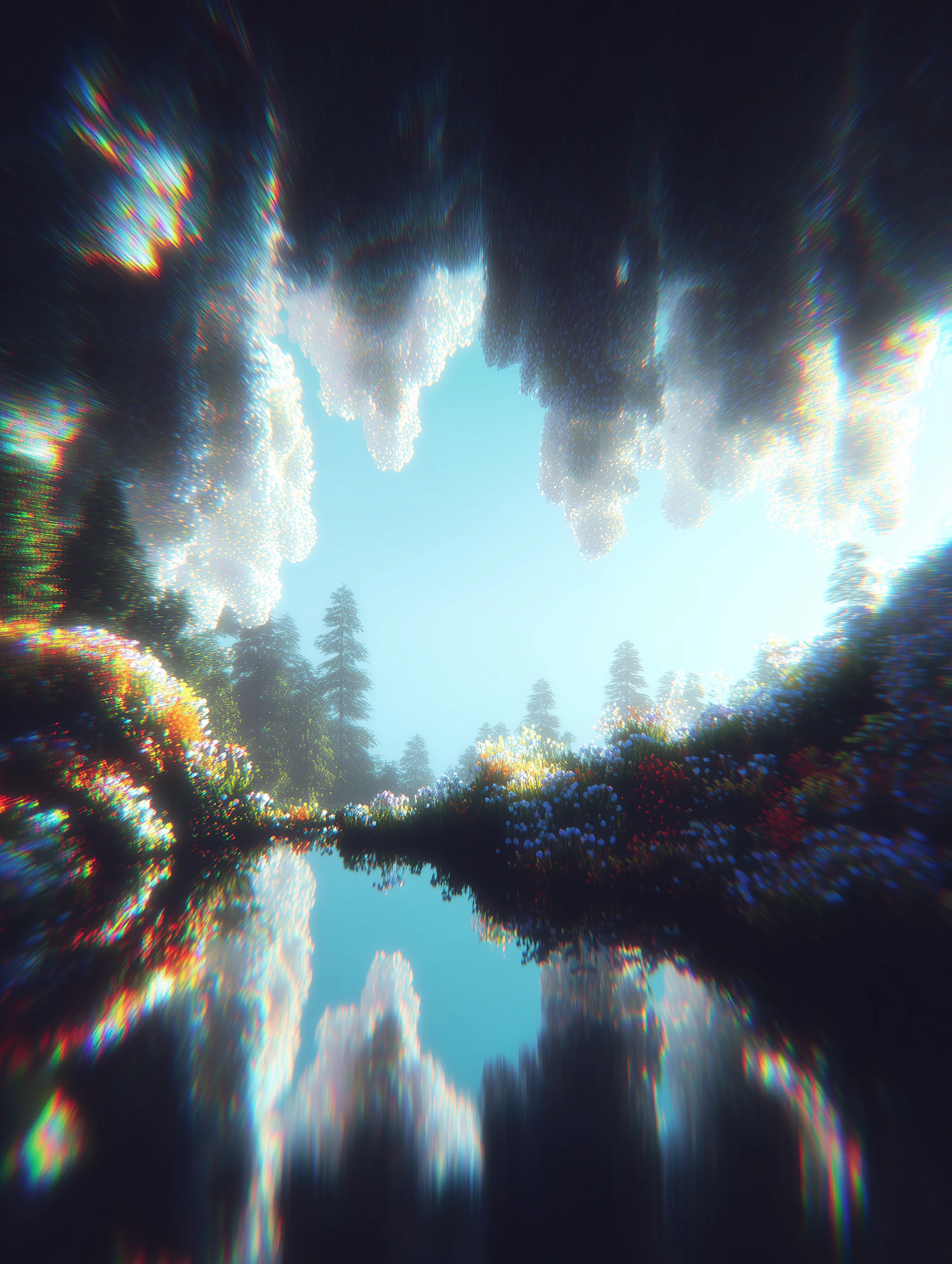 A surreal landscape with vibrant flowers, reflective water, and a dreamy atmosphere enhanced by unique visual effects.