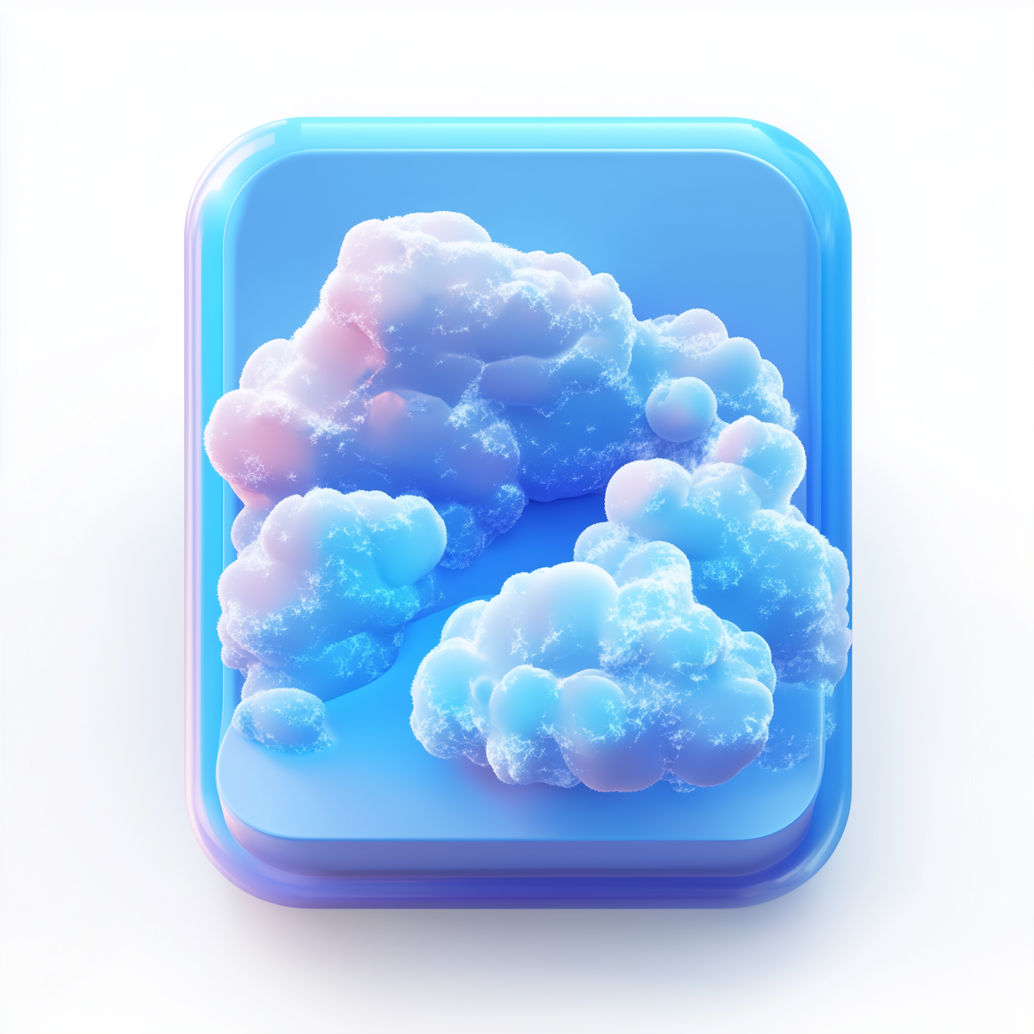 Dreamy 3D illustration of pastel clouds in a glossy, rounded frame with a blue gradient background. Perfect for tech or creative concepts.