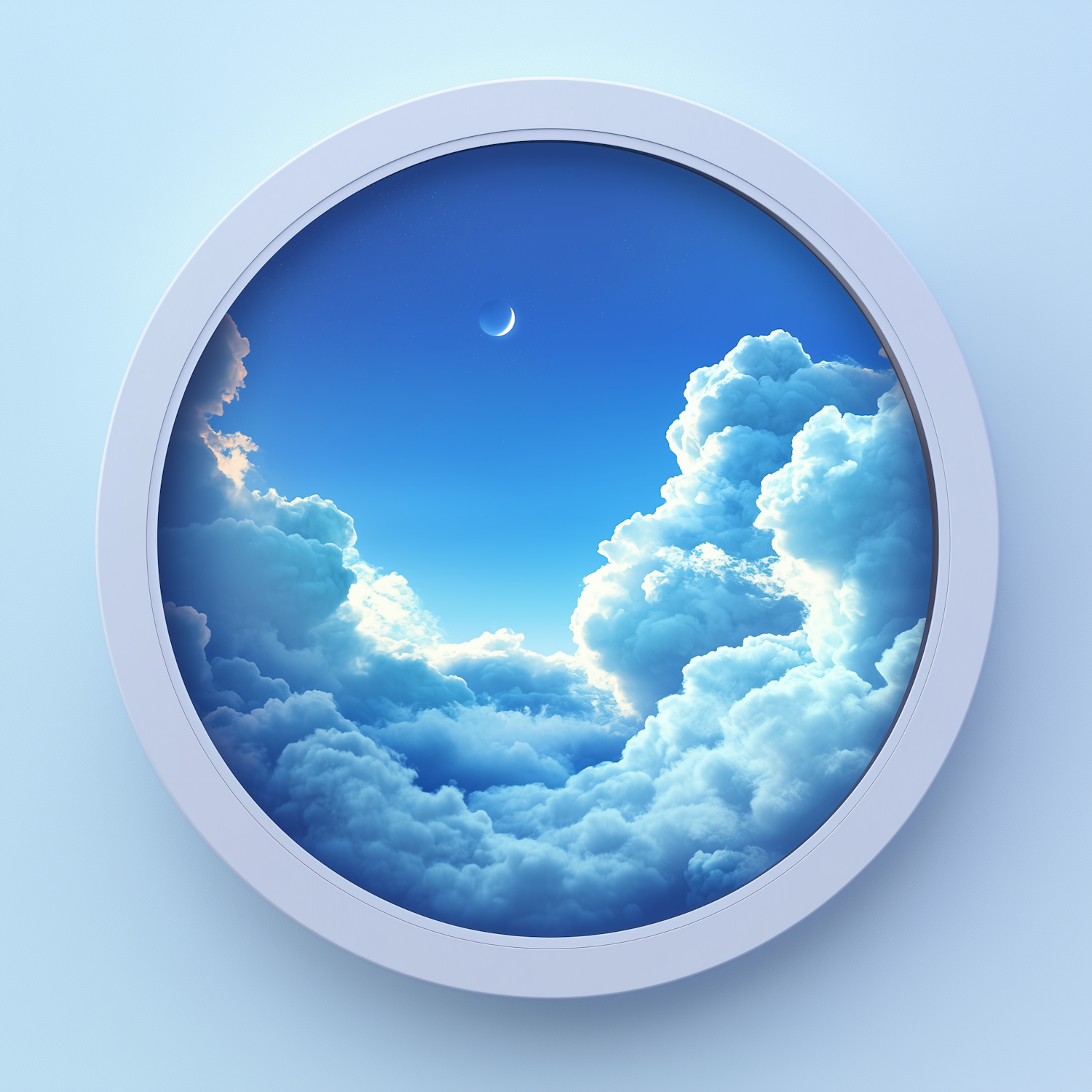 Circular window frame showcasing a dreamy sky with fluffy clouds and a crescent moon, set against a pale blue background.