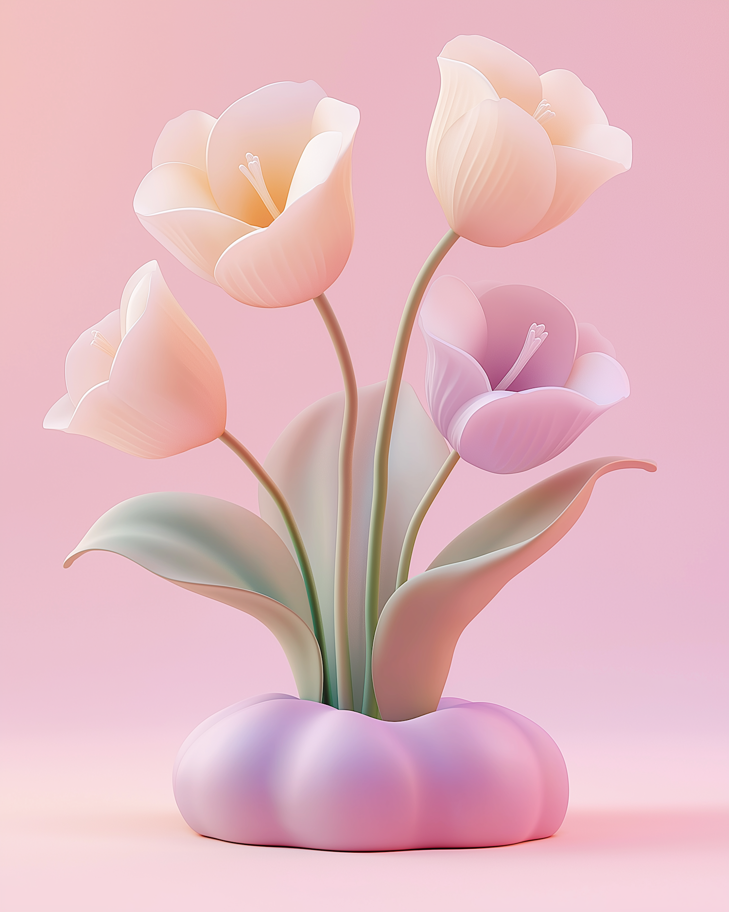 Dreamy 3D tulip illustration in pastel pinks and lavenders, with soft gradients and a whimsical cushion-like base.