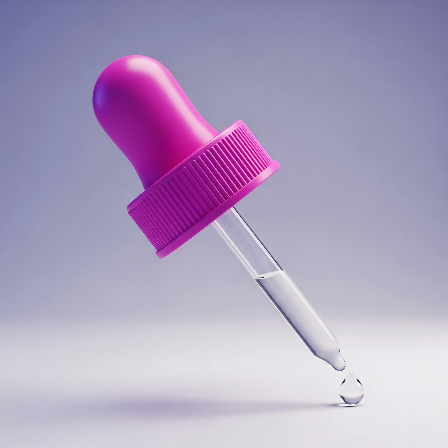 A vibrant pink dropper with a clear glass tube, tilted with a droplet about to fall, set against a soft purple gradient background.