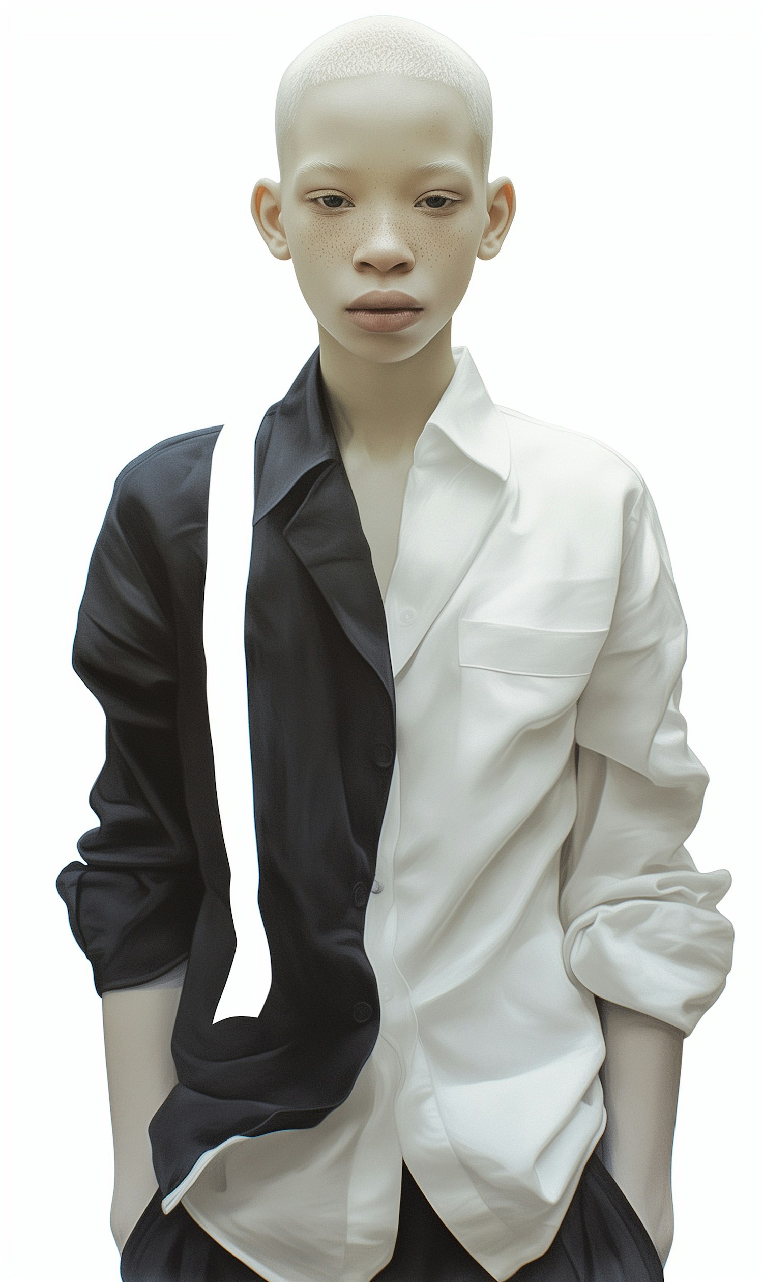 A striking portrait of a person in a half black, half white shirt, showcasing unique fashion and a calm expression.