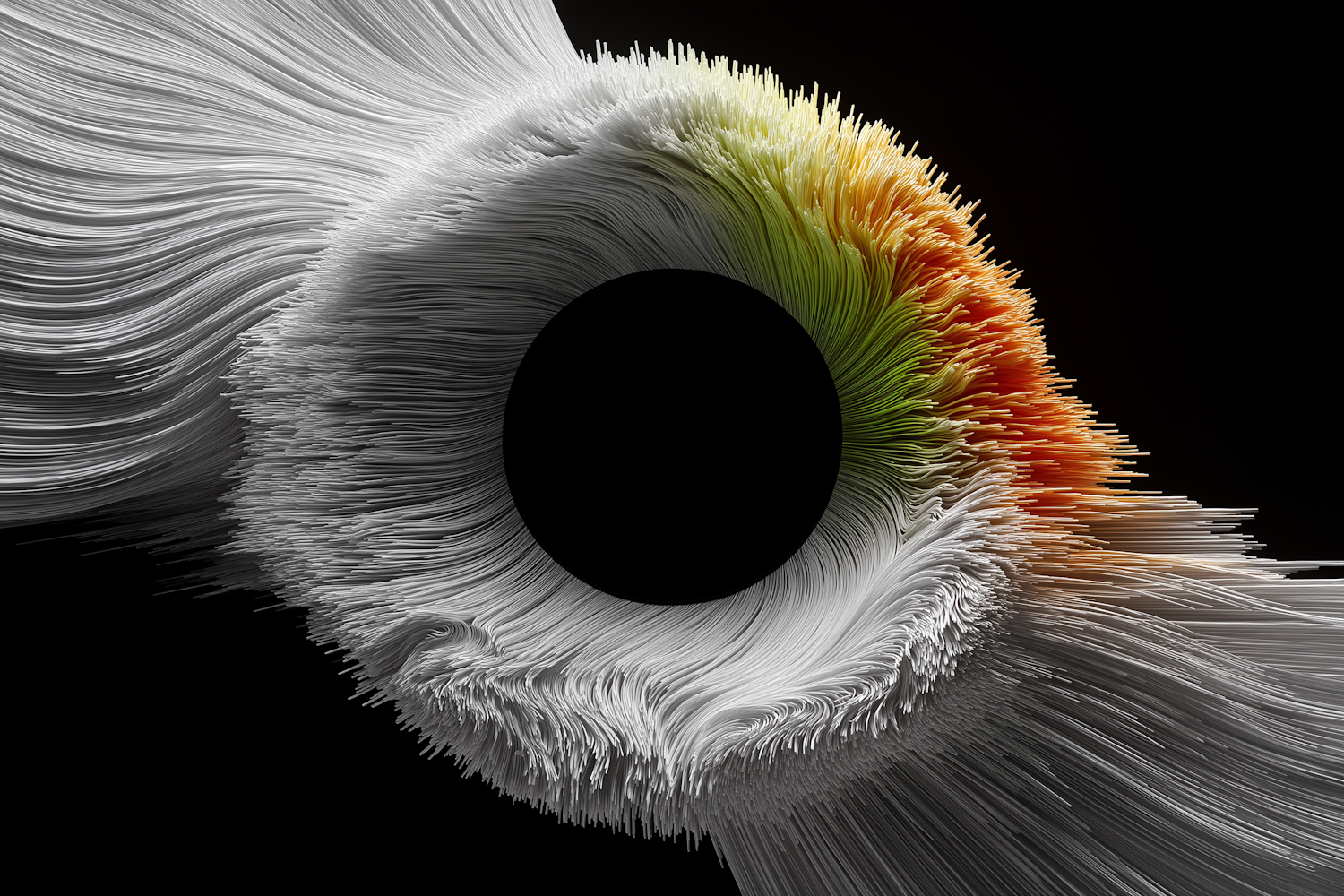 Abstract art with flowing strands in white, yellow, and orange around a black void, creating a dynamic and vibrant visual effect.