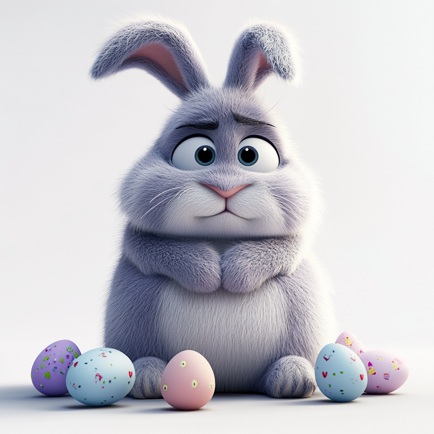 Adorable animated gray bunny surrounded by pastel Easter eggs, looking cute and festive with a slightly worried expression.