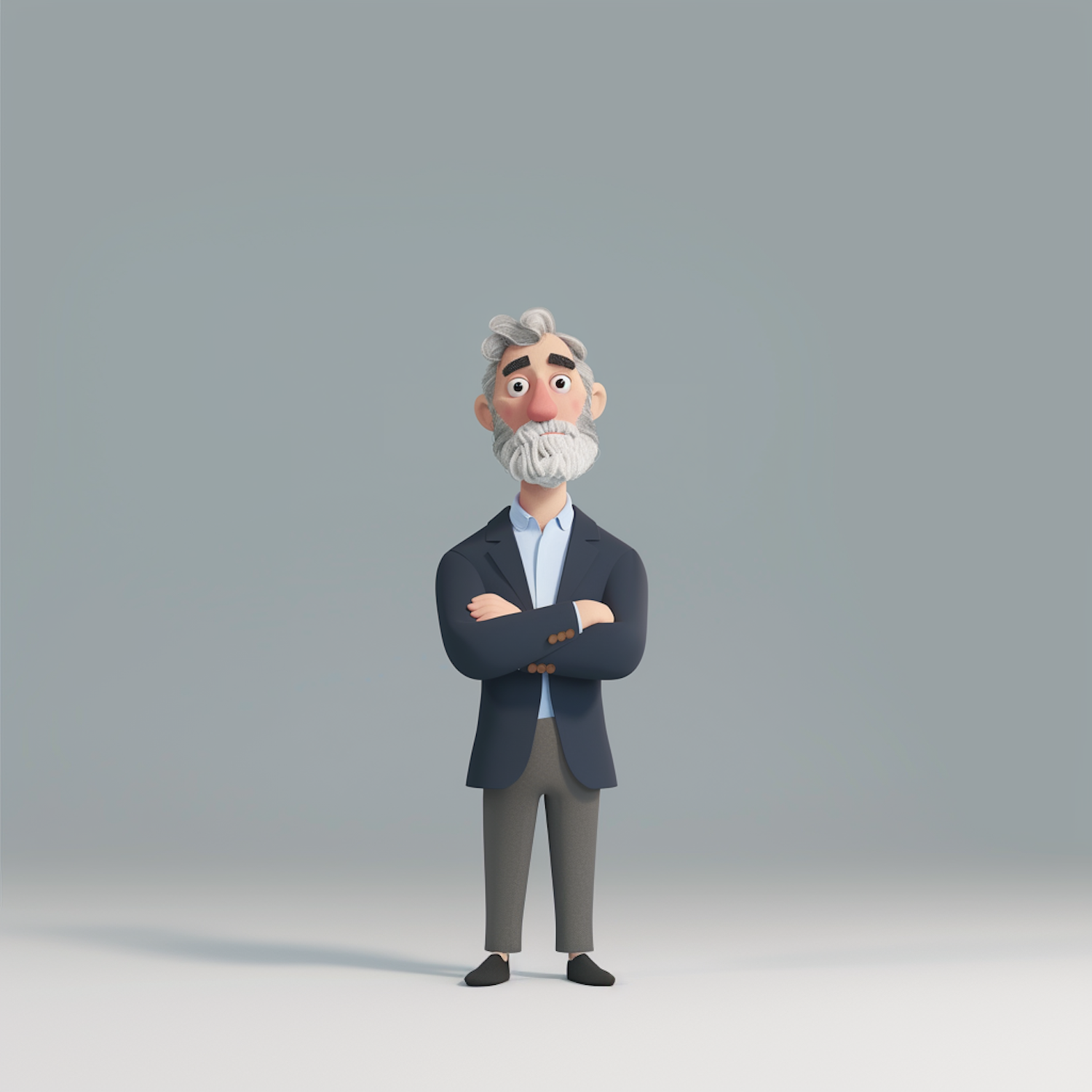 3D cartoon of an elderly man with a white beard, wearing a blazer and standing with arms crossed on a plain gray background.