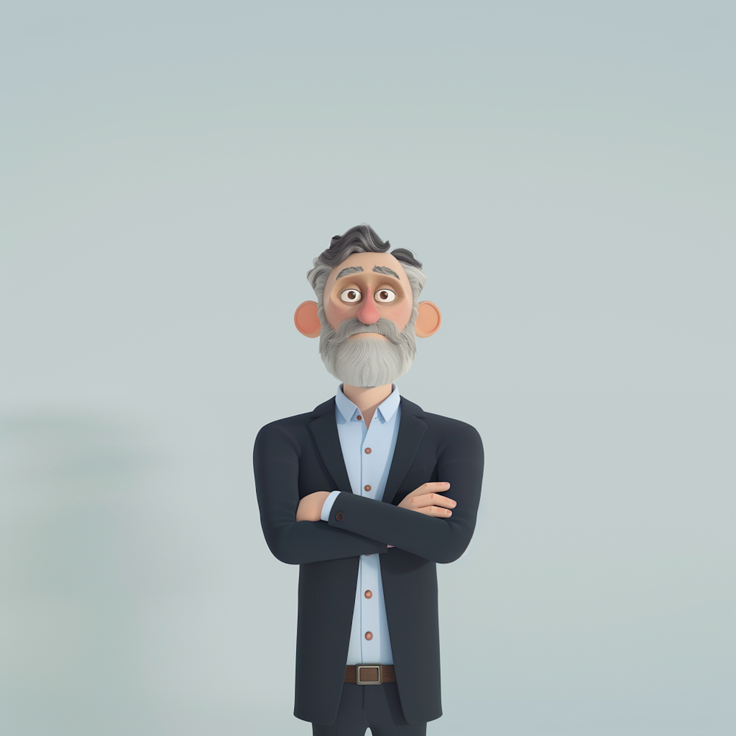 3D cartoon-style elderly man with a gray beard, wearing a black suit and light blue shirt, standing with arms crossed on a plain background.