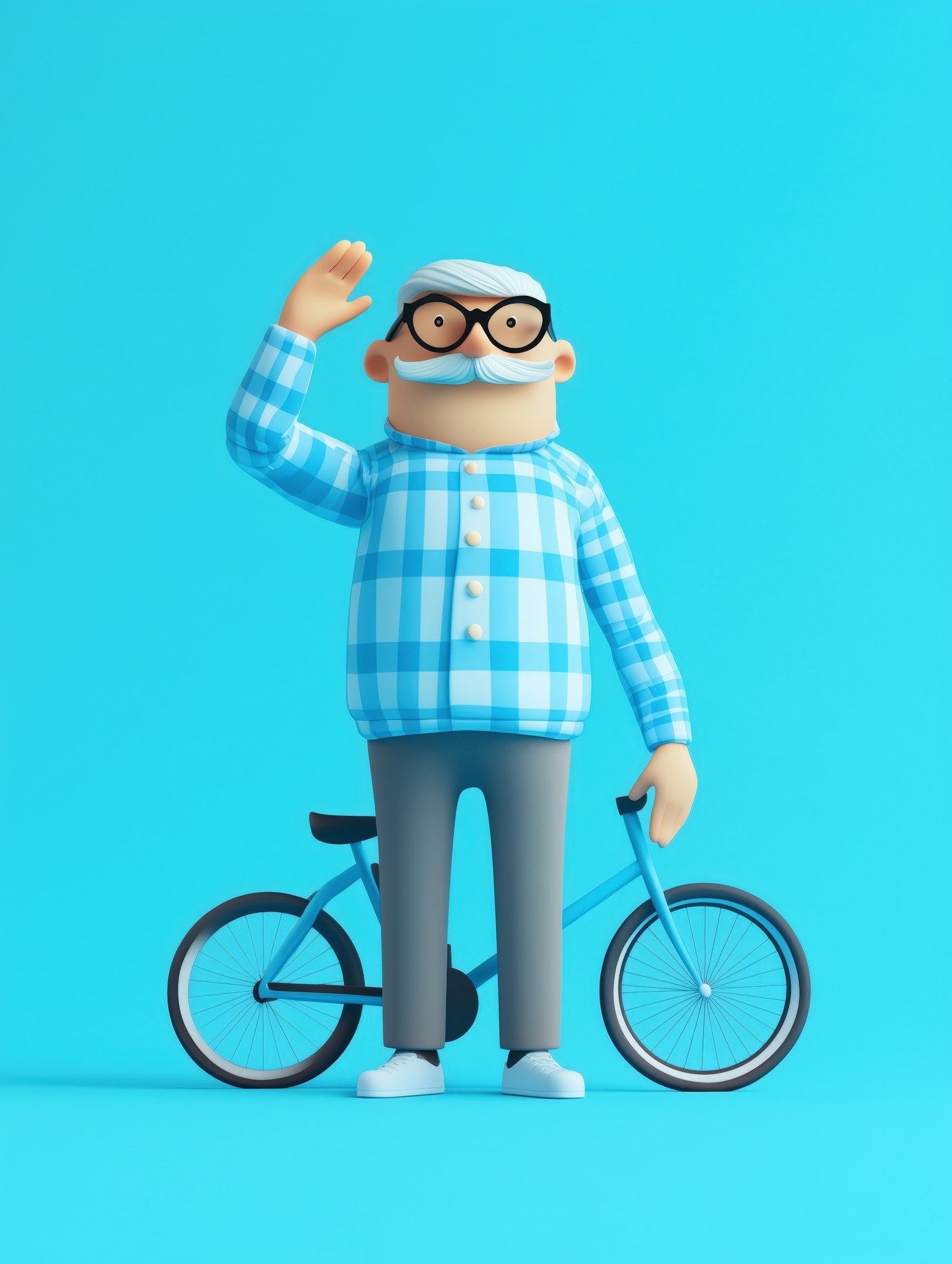 3D illustration of a cheerful elderly man saluting next to a blue bicycle, wearing a checkered shirt and glasses on a bright blue background.
