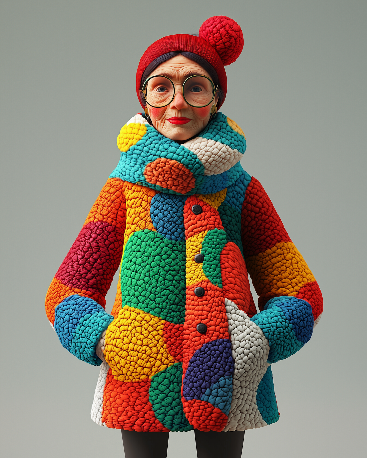 Elderly woman in a colorful, textured coat with a red knit hat and oversized glasses, set against a muted green background.