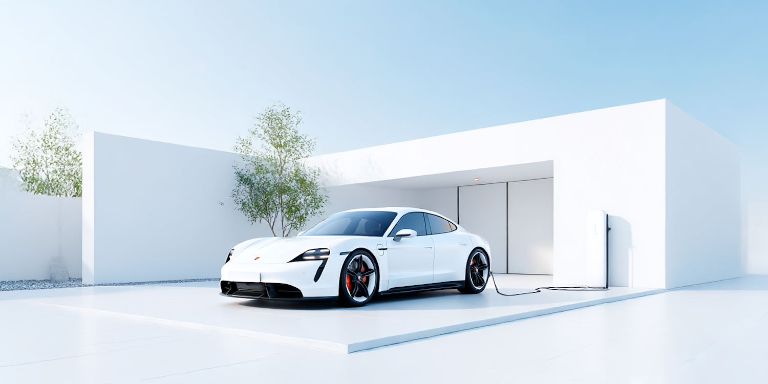 A white electric car charging in front of a modern white building under a clear blue sky, showcasing sleek design and sustainability.