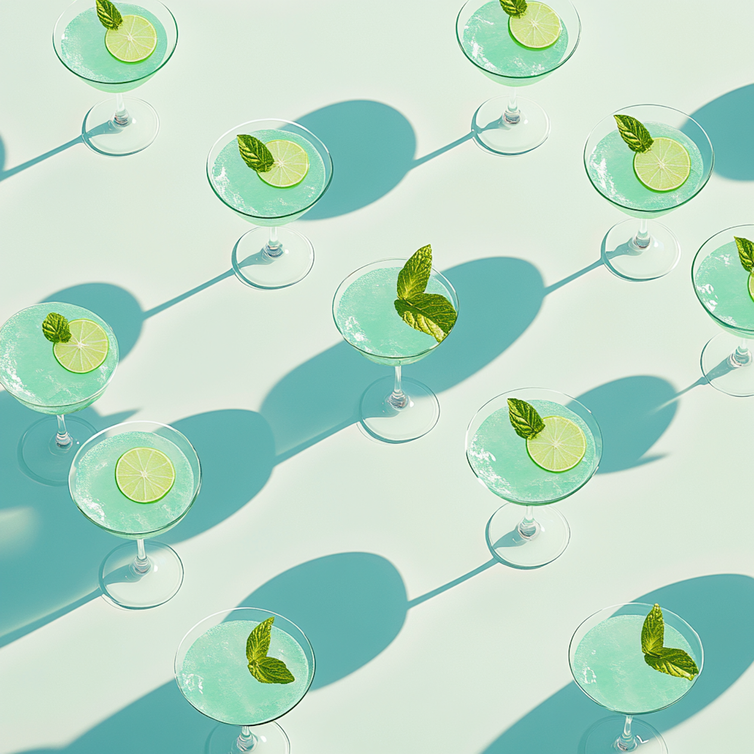Elegant cocktail glasses with lime and mint on a mint green background, casting artistic shadows. Refreshing and visually appealing.