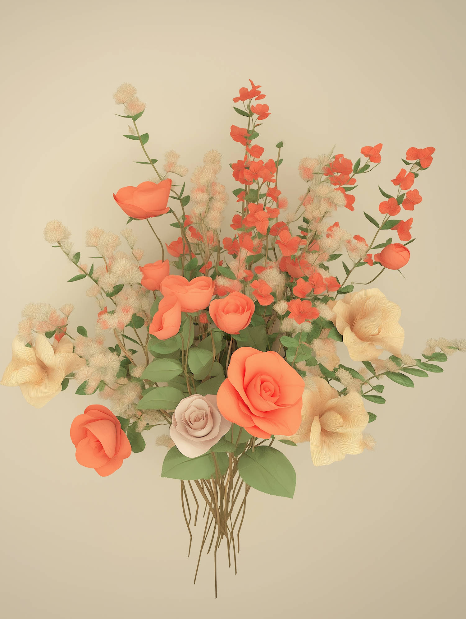 Elegant bouquet with peach and cream roses, fluffy white blooms, and green leaves on a beige background. Serene and sophisticated.