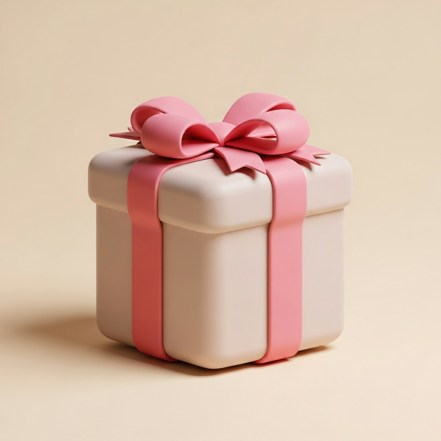 A beige gift box with a pink ribbon and bow, rendered in 3D with smooth edges and a neutral background for a clean, modern look.