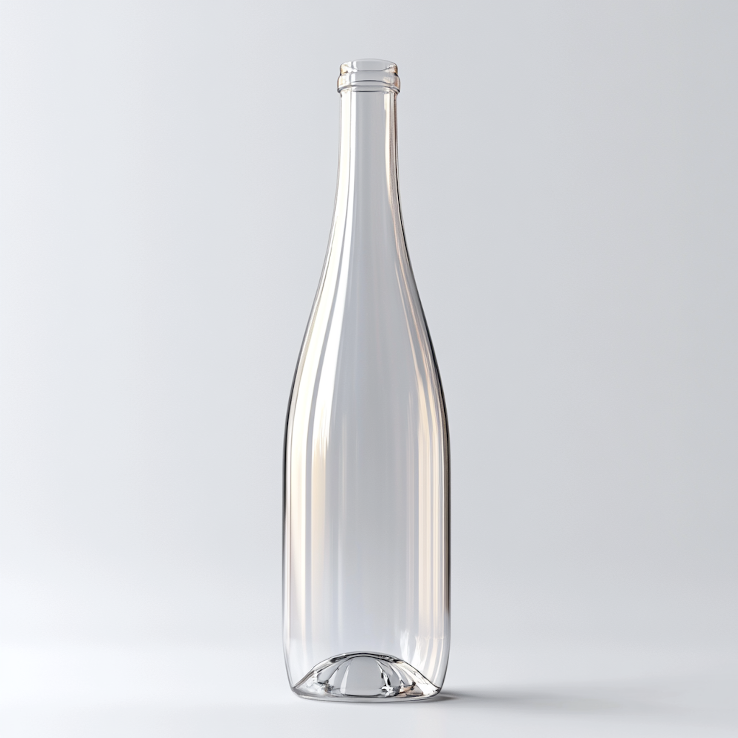 Elegant clear glass bottle with a slender shape and smooth surface, set against a light gray background.