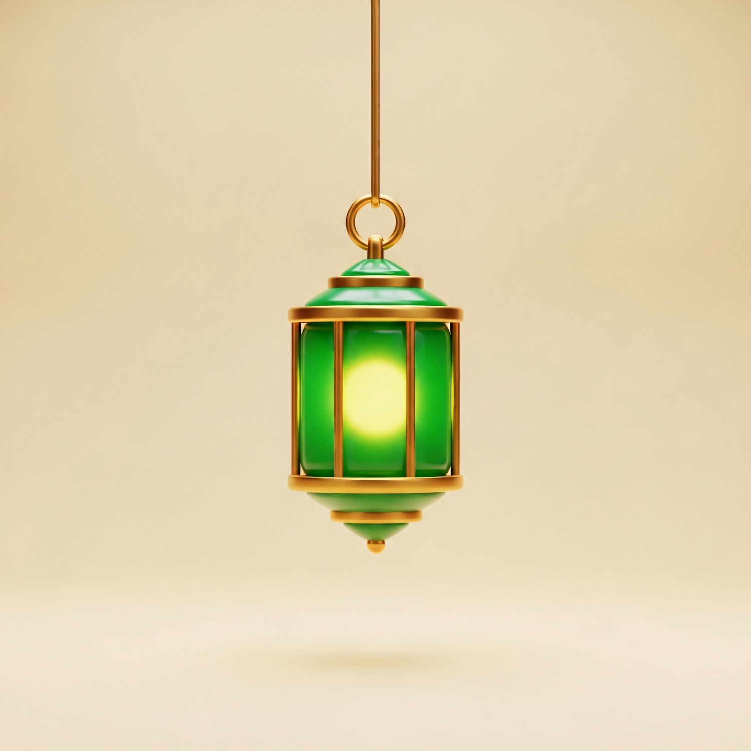 A glowing green lantern with golden accents, suspended against a soft beige background, creating a warm and elegant ambiance.