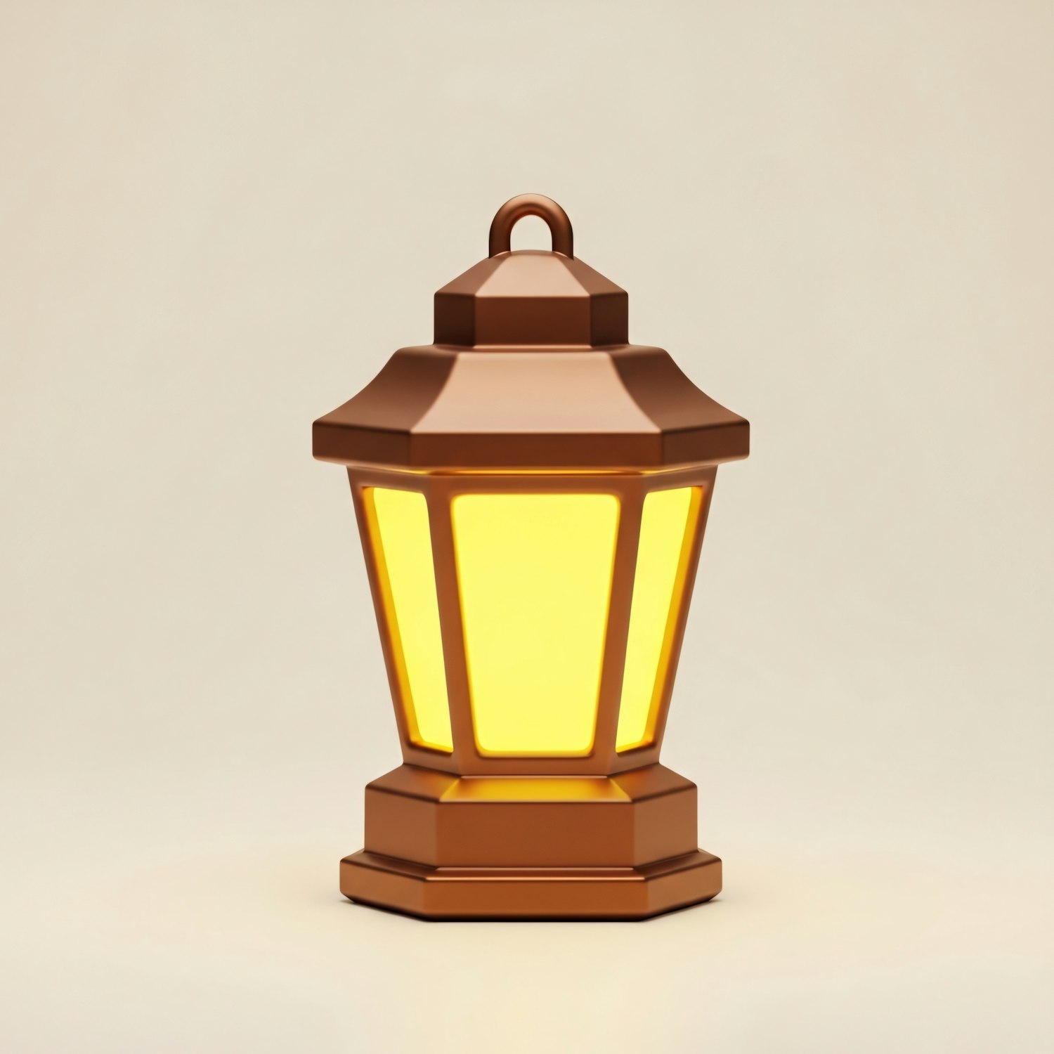 A 3D-rendered bronze lantern glowing warmly against a neutral background, showcasing a classic and elegant design.