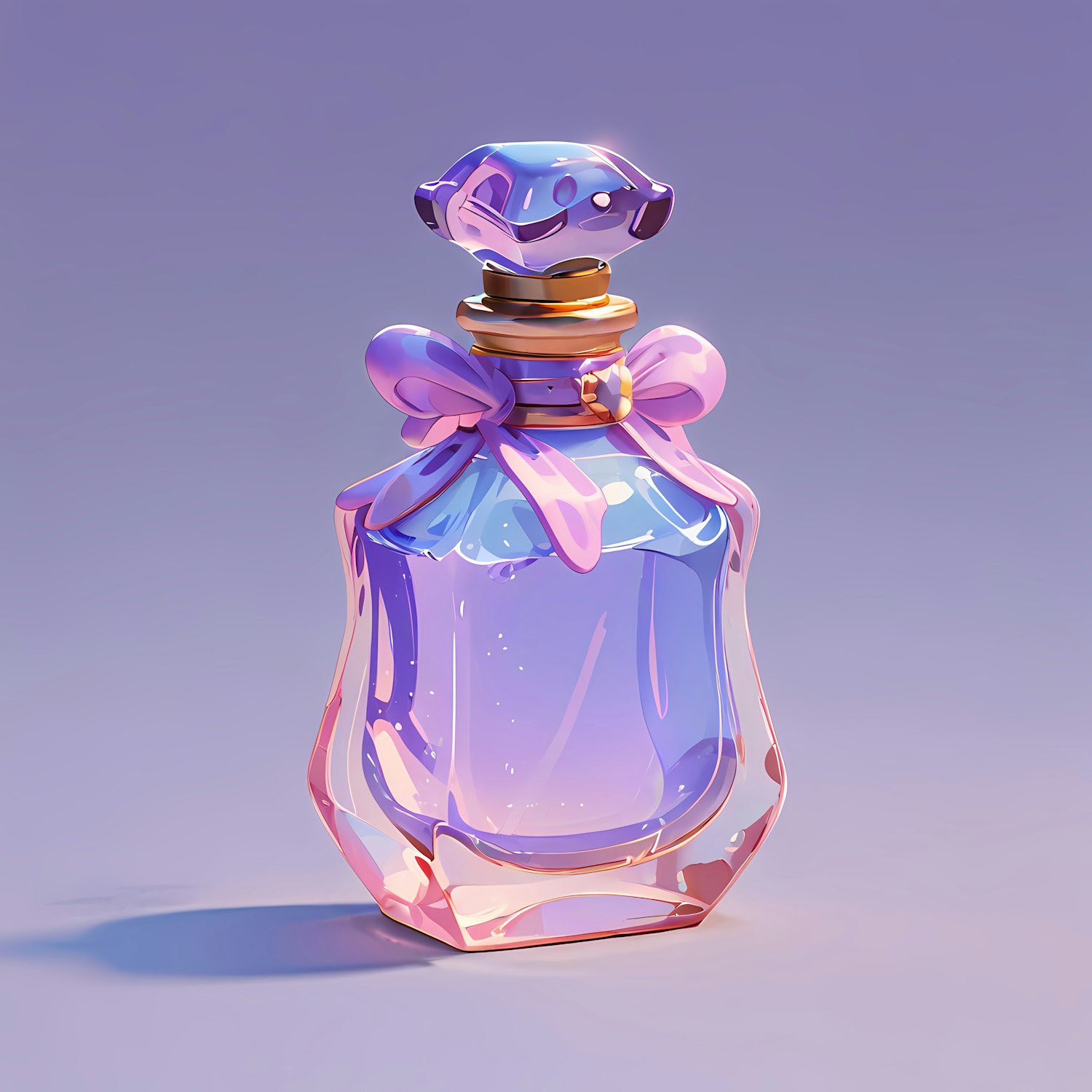 Elegant perfume bottle with pink and purple hues, adorned with a pink bow and golden accents, set against a soft gradient background.