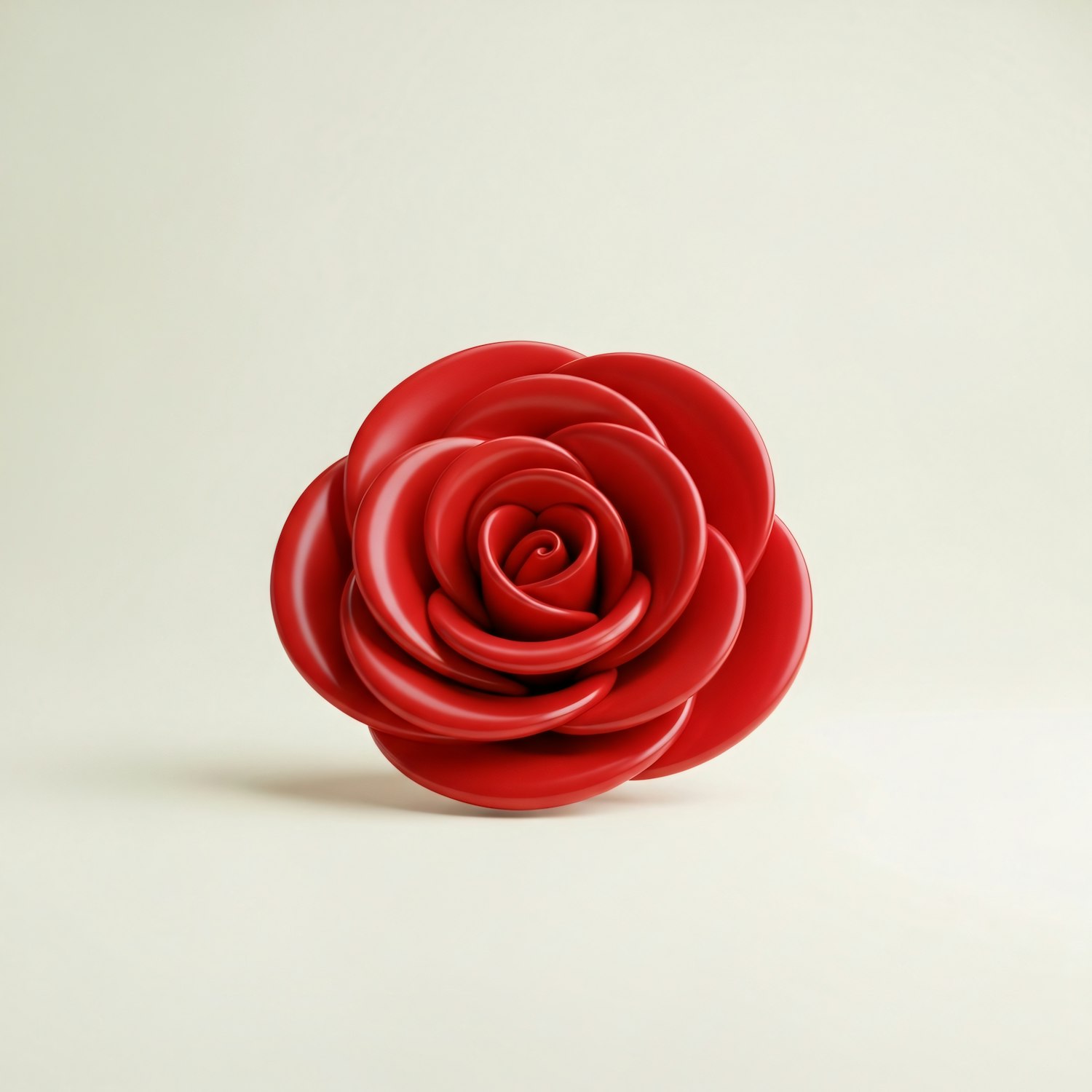A vibrant red rose with a sculpted, glossy finish set against a soft, off-white background, showcasing its intricate petal design.