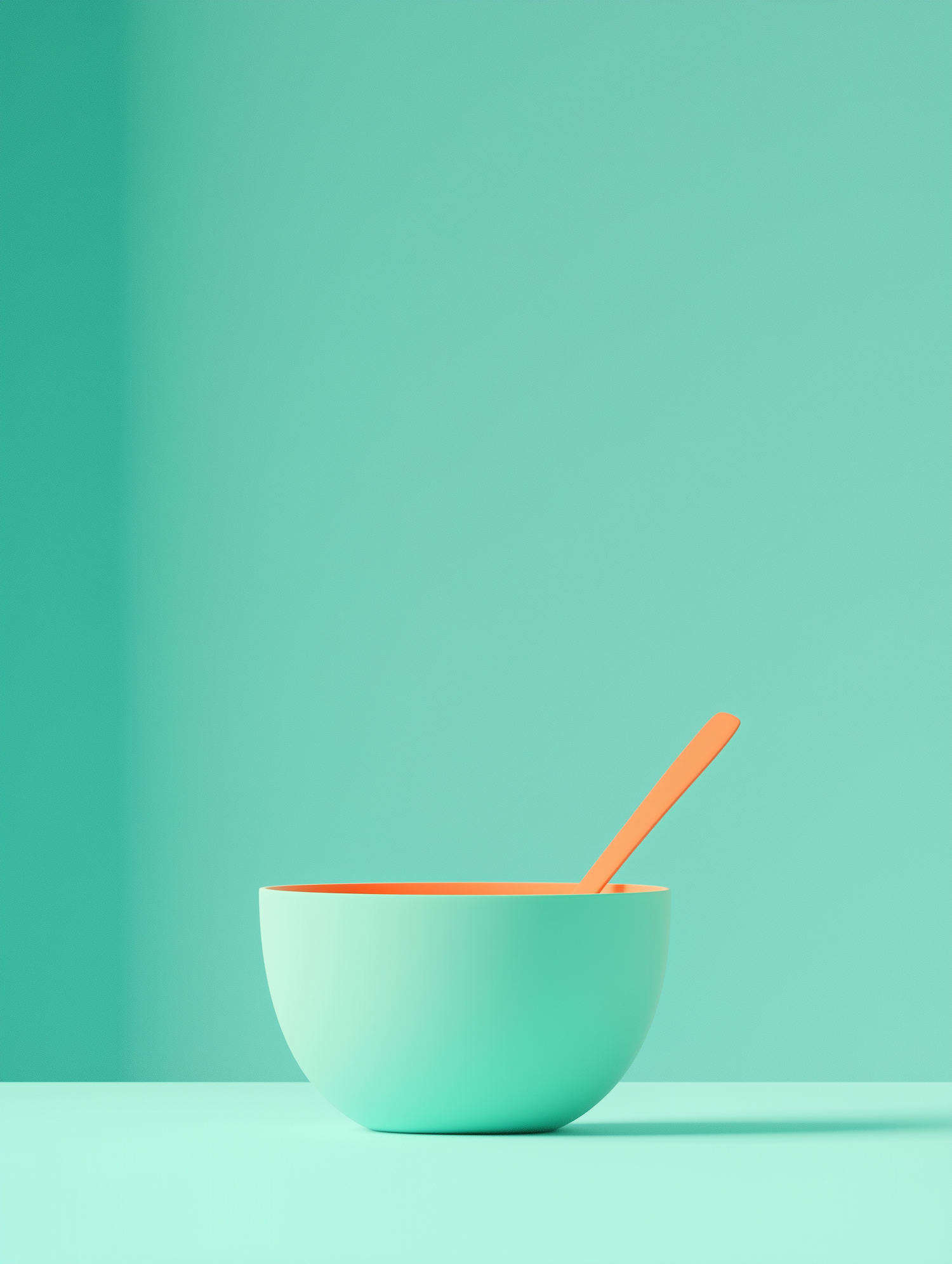 Minimalist mint green bowl with orange interior and spoon on matching background. Modern and elegant design.
