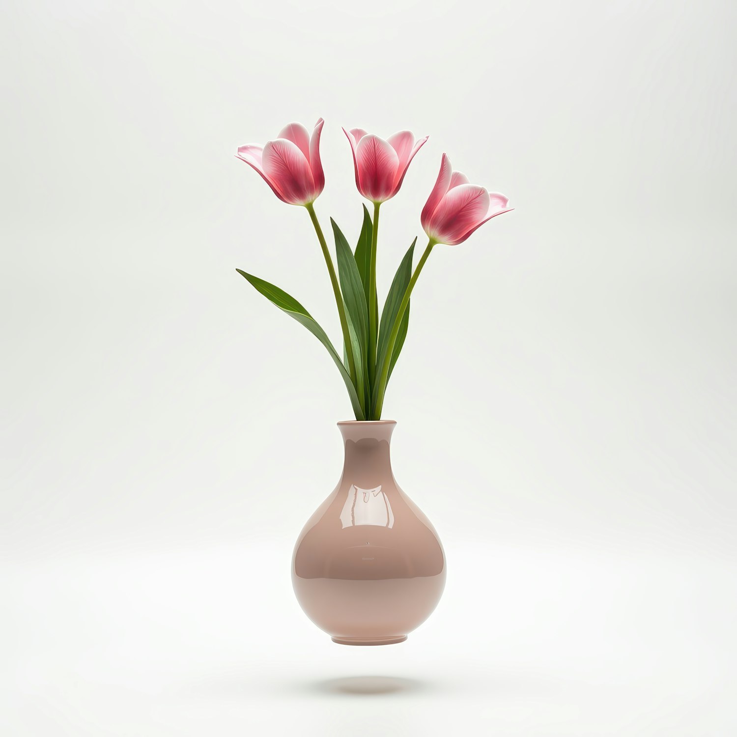 Elegant pink tulips in a glossy beige vase against a light gray background, showcasing minimalist floral beauty.