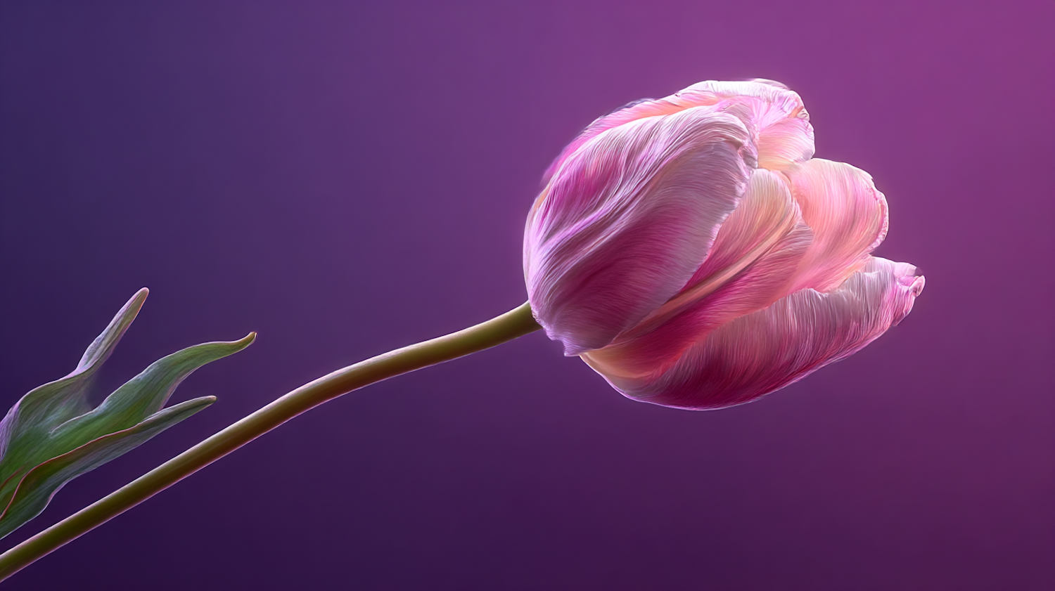 A close-up of a pink tulip with detailed petals against a purple gradient background, showcasing its delicate beauty.