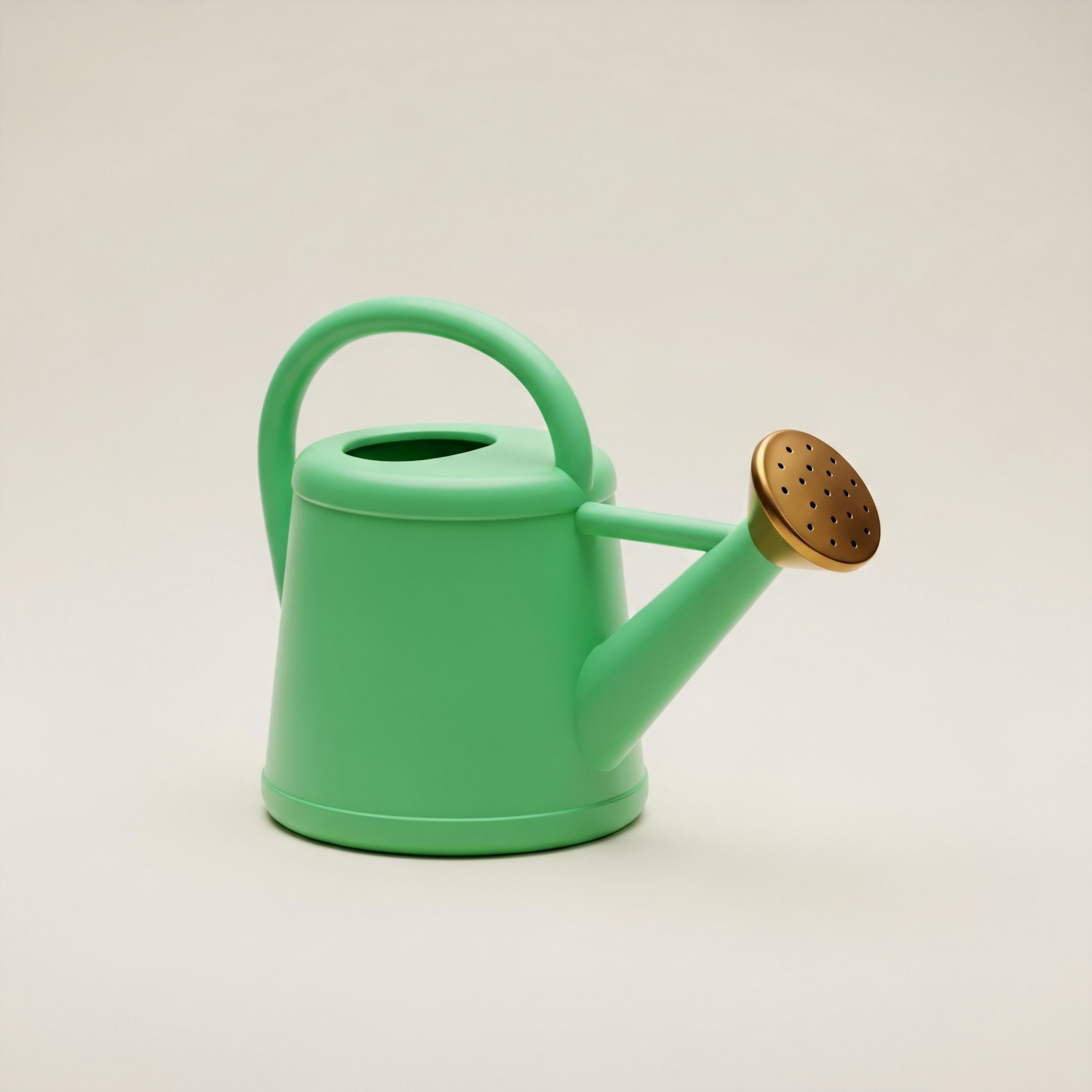 A green watering can with a golden spout, perfect for gardening, displayed against a neutral background for a clean and modern look.