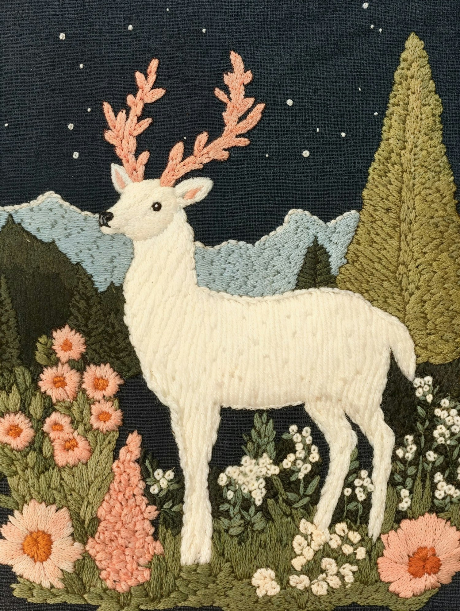 Intricate embroidery of a white deer with pink antlers in a lush forest, surrounded by flowers and a starry night sky.