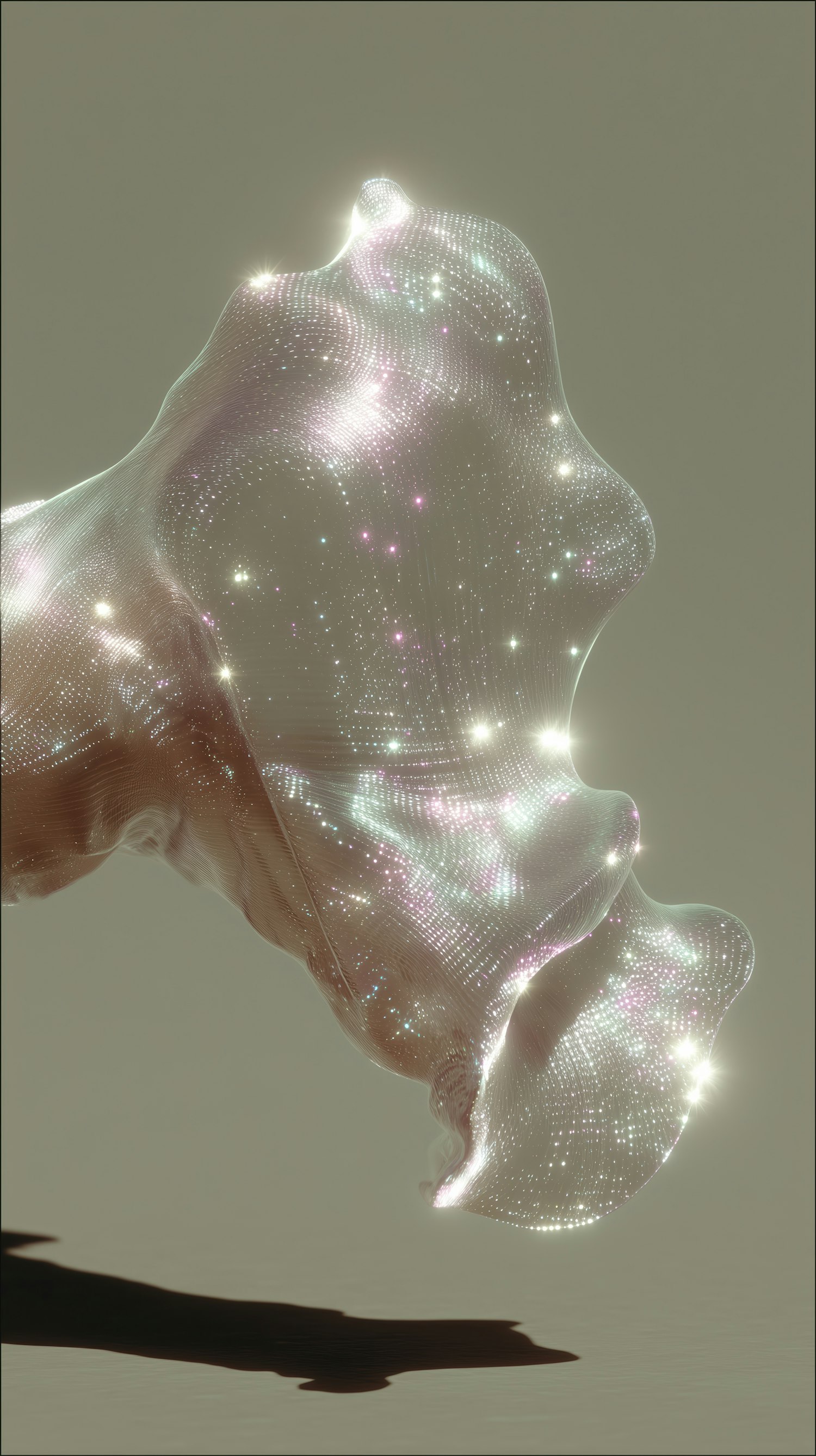 Abstract 3D art of a glowing, translucent form with multicolored lights, floating against a beige background. Ethereal and futuristic design.