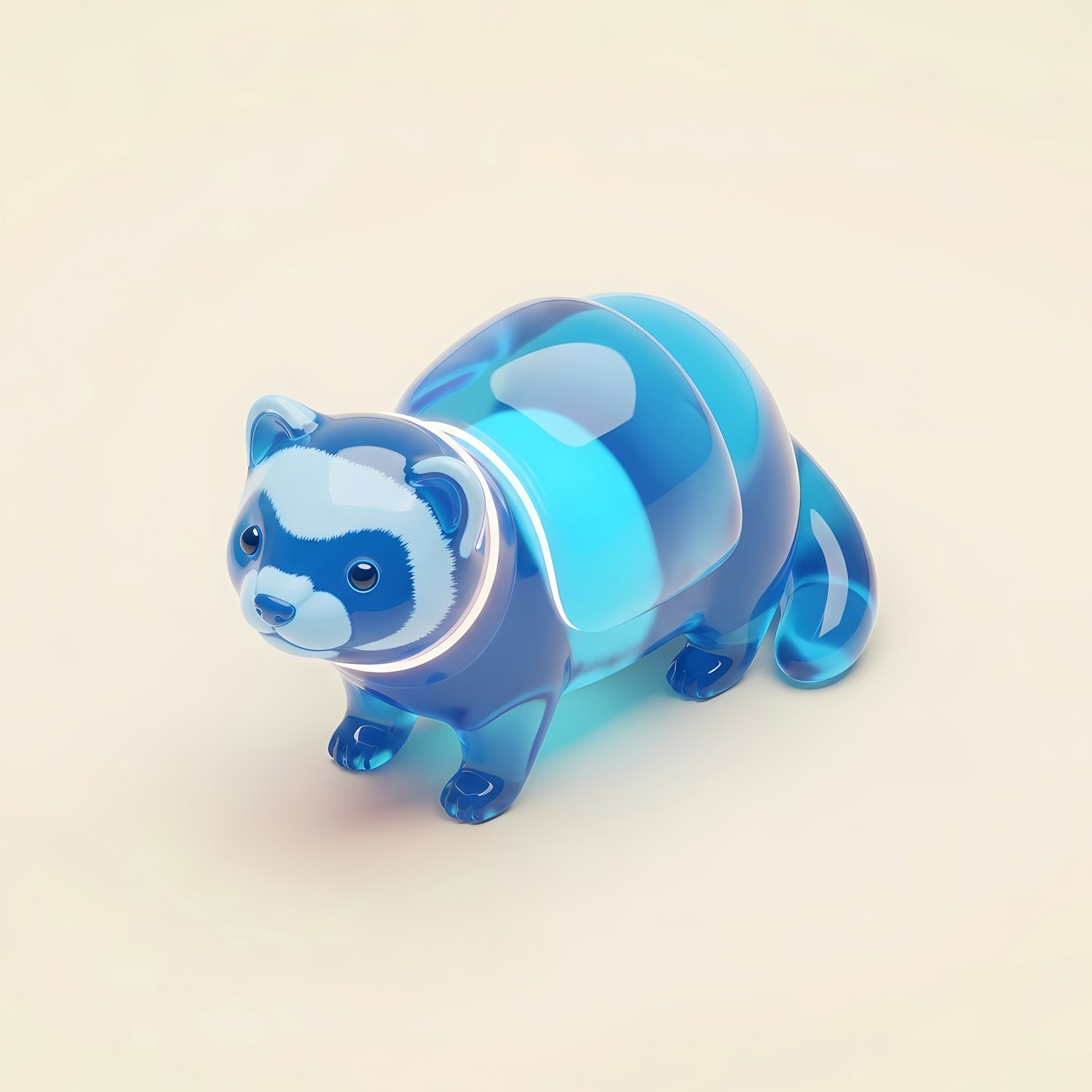 A 3D illustration of a translucent blue animal figure, resembling a ferret or raccoon, with a glossy and luminous design on a neutral background.