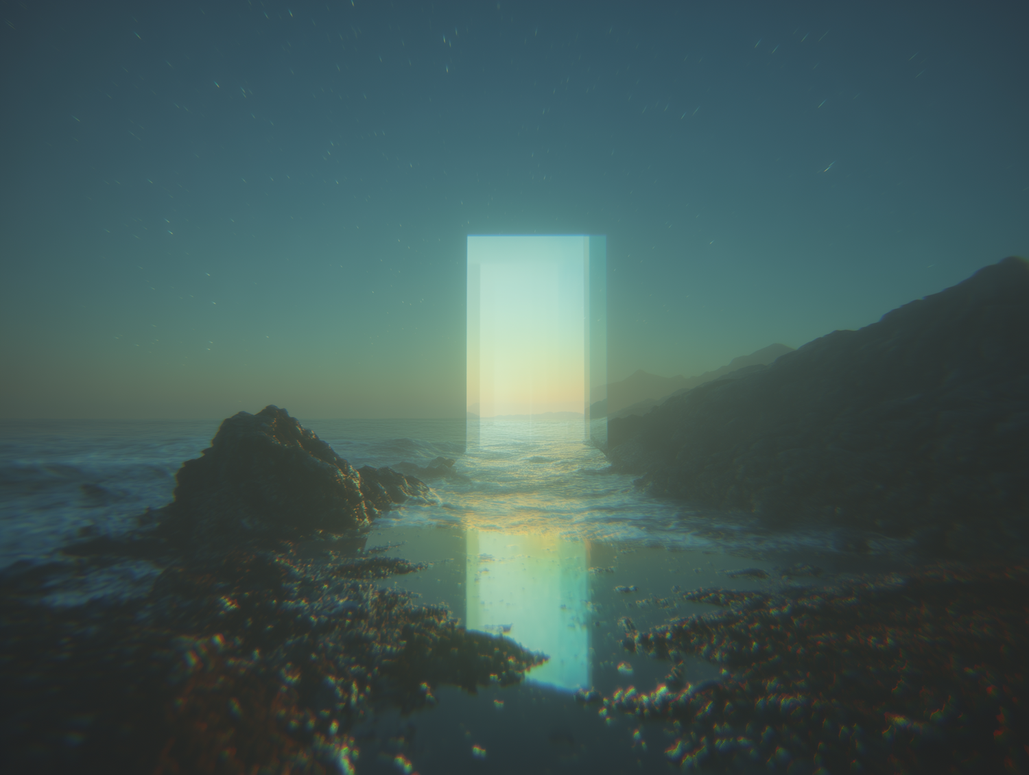 A surreal coastal scene with a glowing portal reflecting the ocean and sky, set against a tranquil dusk backdrop.