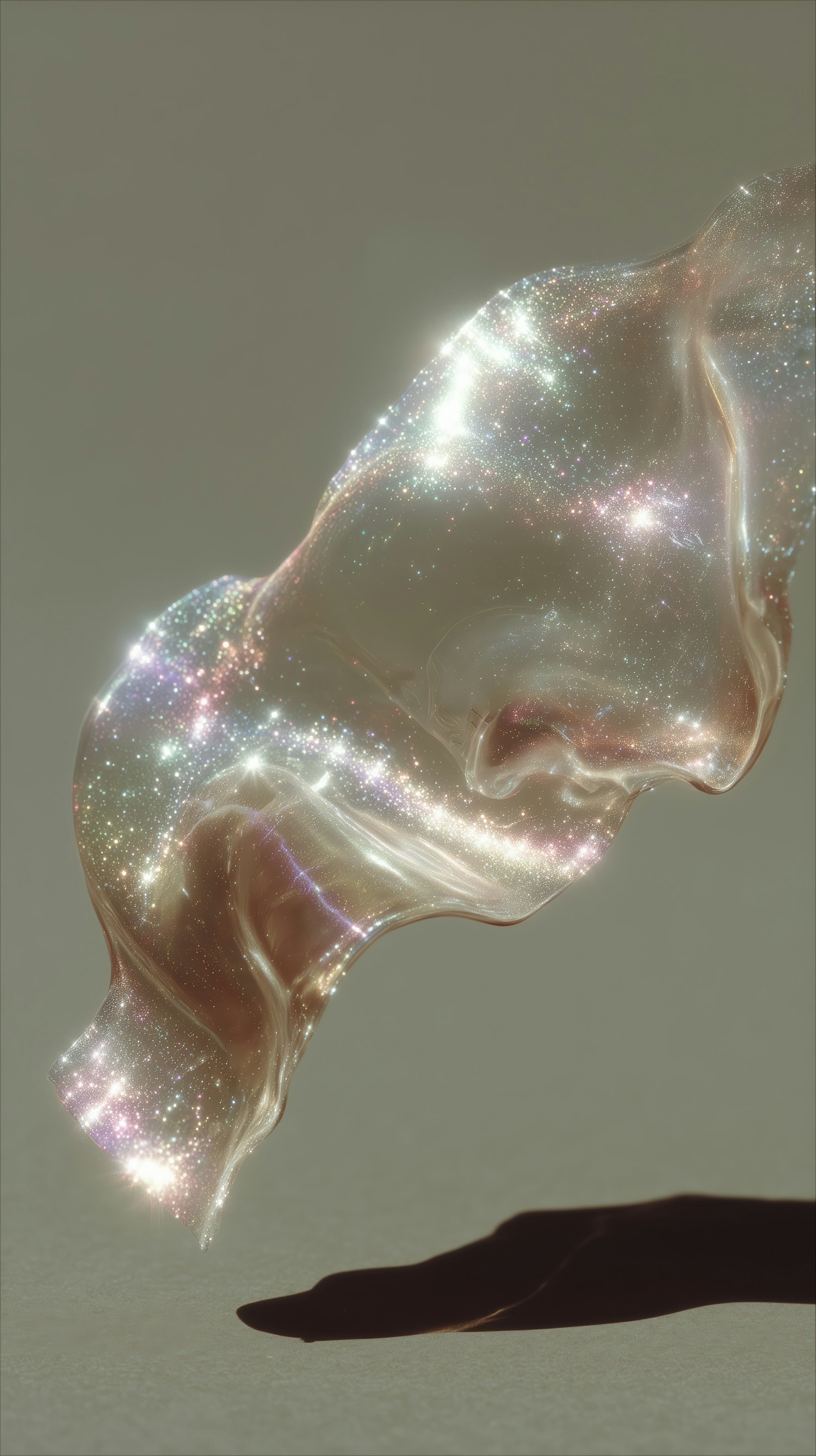A translucent fabric-like material sparkles with cosmic lights, suspended in mid-air against a muted beige background. Ethereal and magical.