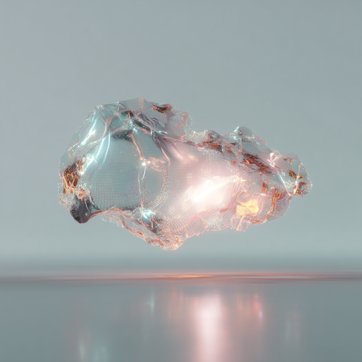 A glowing, translucent 3D object with a glass-like texture and intricate details floats in a minimalistic, softly lit environment.