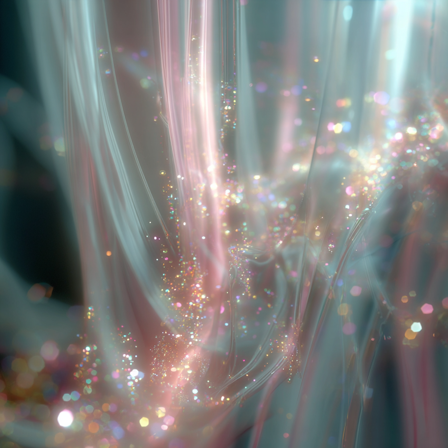 Abstract pastel ribbons and glittering particles create a dreamy, ethereal scene with soft pink and blue hues.