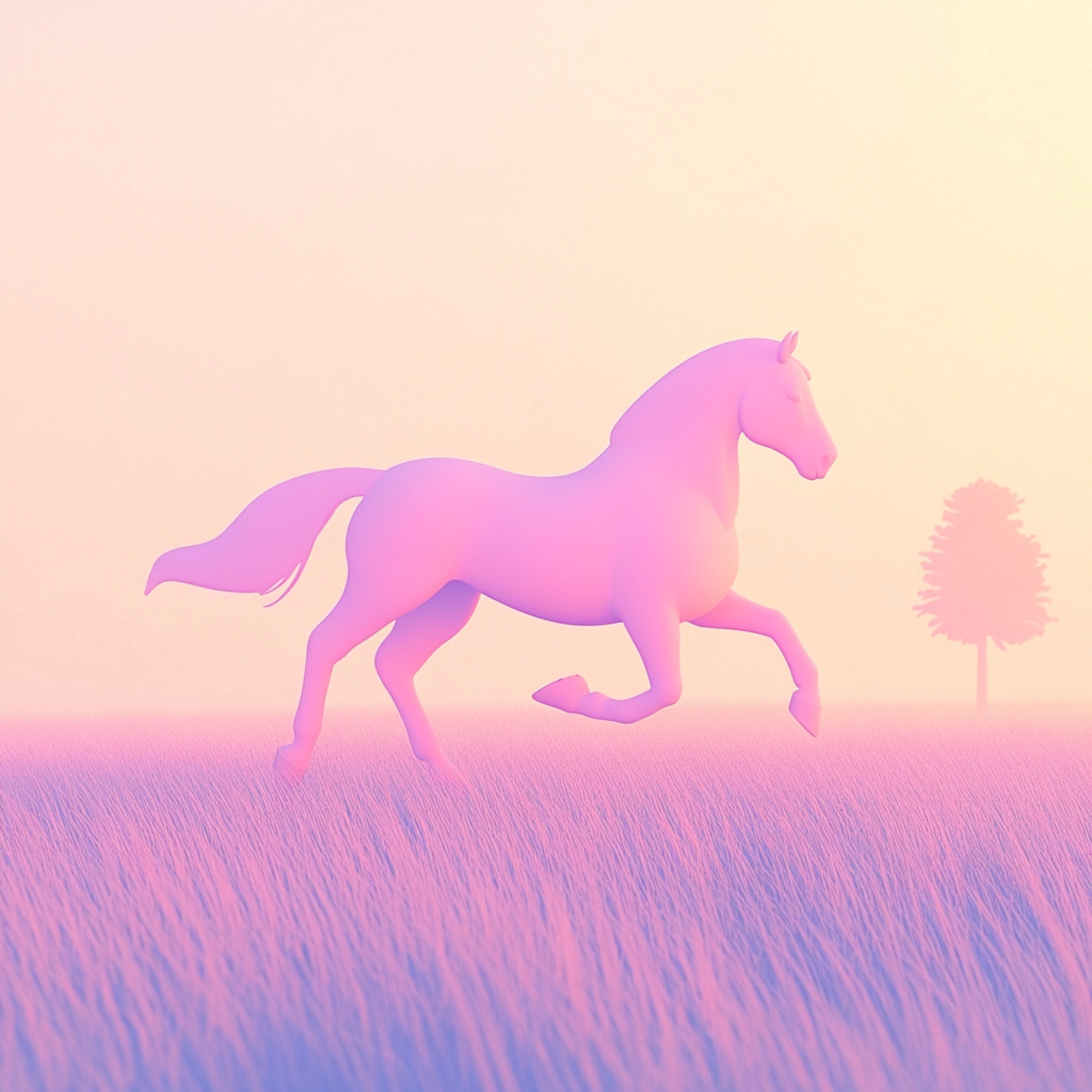 A pastel 3D illustration of a pink horse galloping in a dreamy landscape with soft hues and a distant tree.