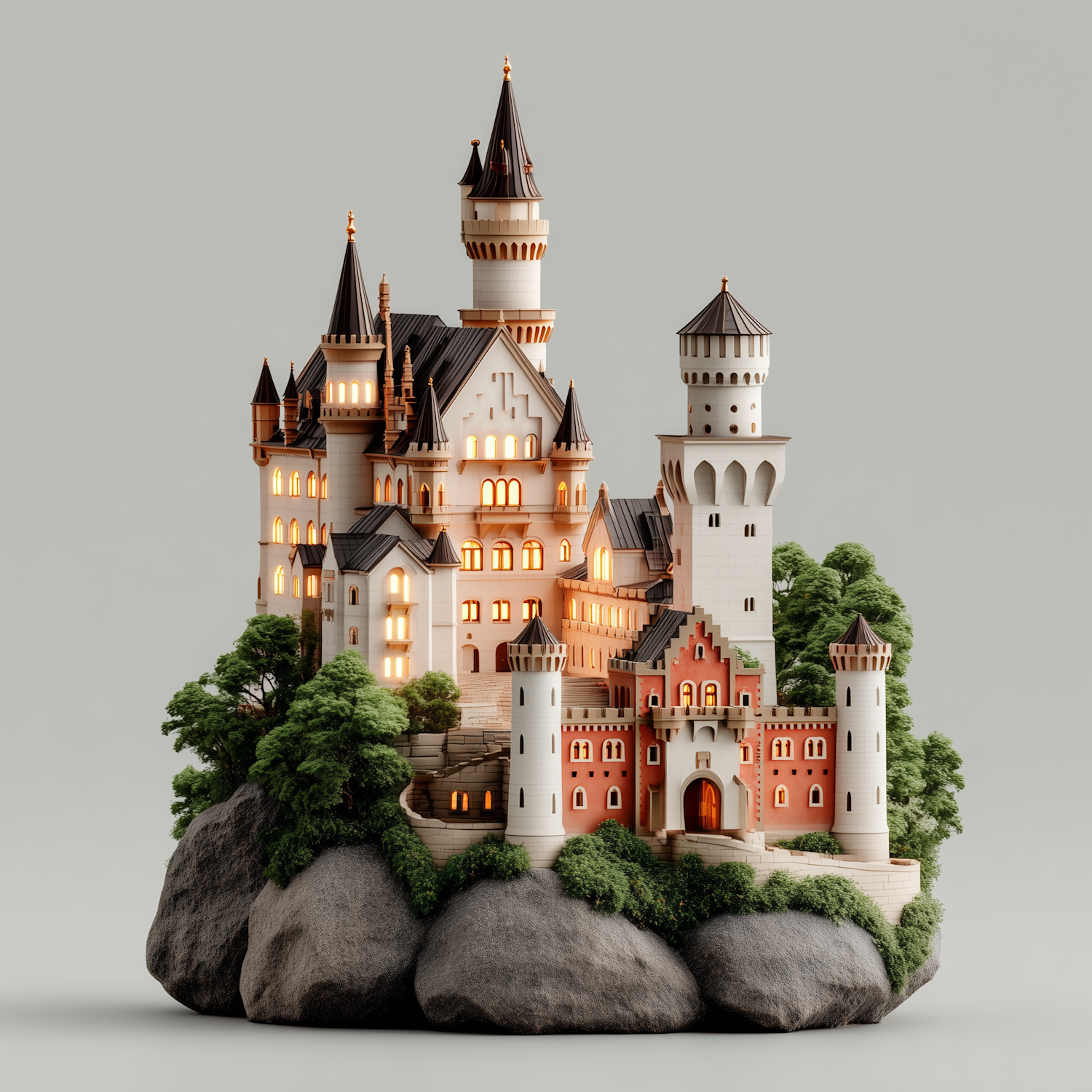 A stunning 3D-rendered castle with glowing windows, intricate towers, and lush greenery, set on a rocky base against a neutral backdrop.