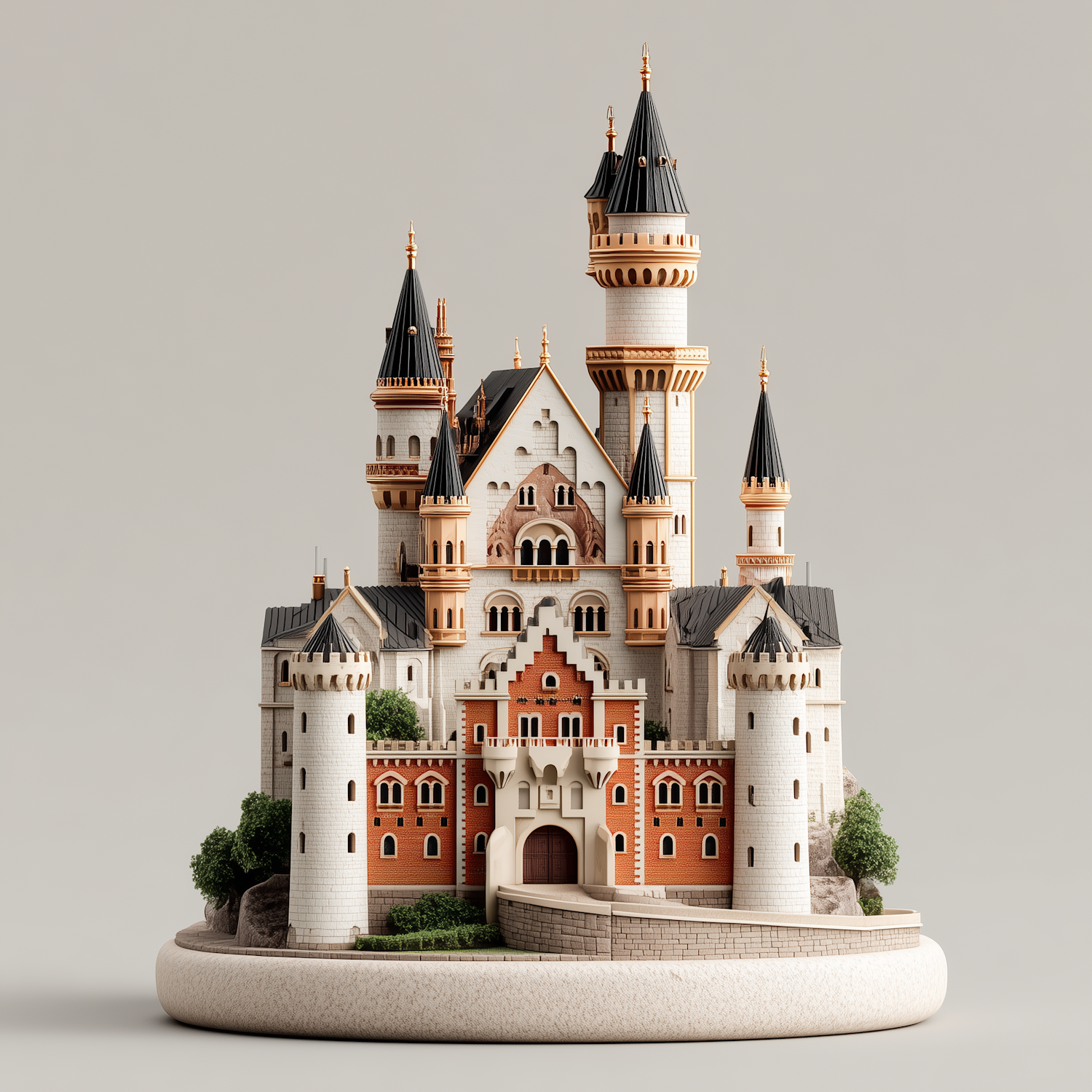 A detailed miniature model of a fairytale castle with intricate towers, vibrant colors, and a circular base with greenery.