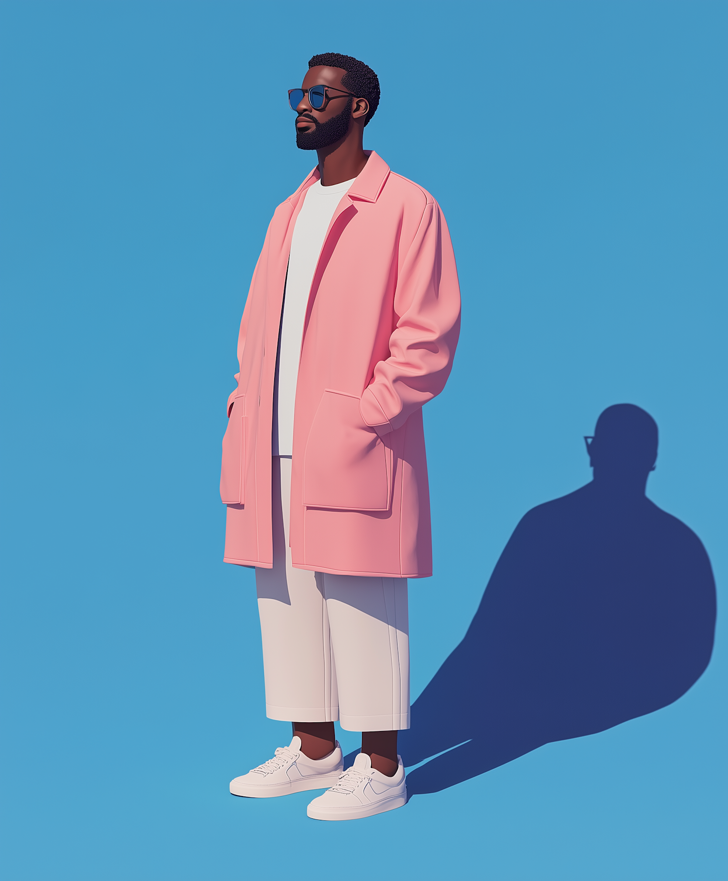 Stylish man in pink coat and sunglasses against a blue background, exuding modern fashion with a minimalist touch.