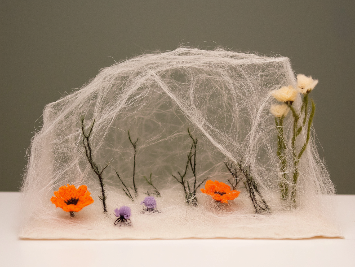 Intricate felt garden with vibrant orange and purple flowers, set against a delicate white fibrous backdrop, creating a whimsical scene.