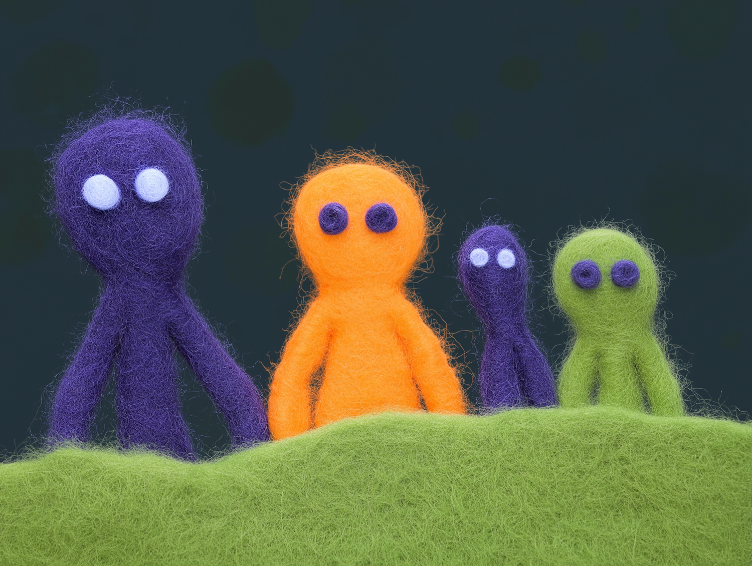Colorful felted wool figures in purple, orange, and green stand on a green surface, creating a whimsical scene.
