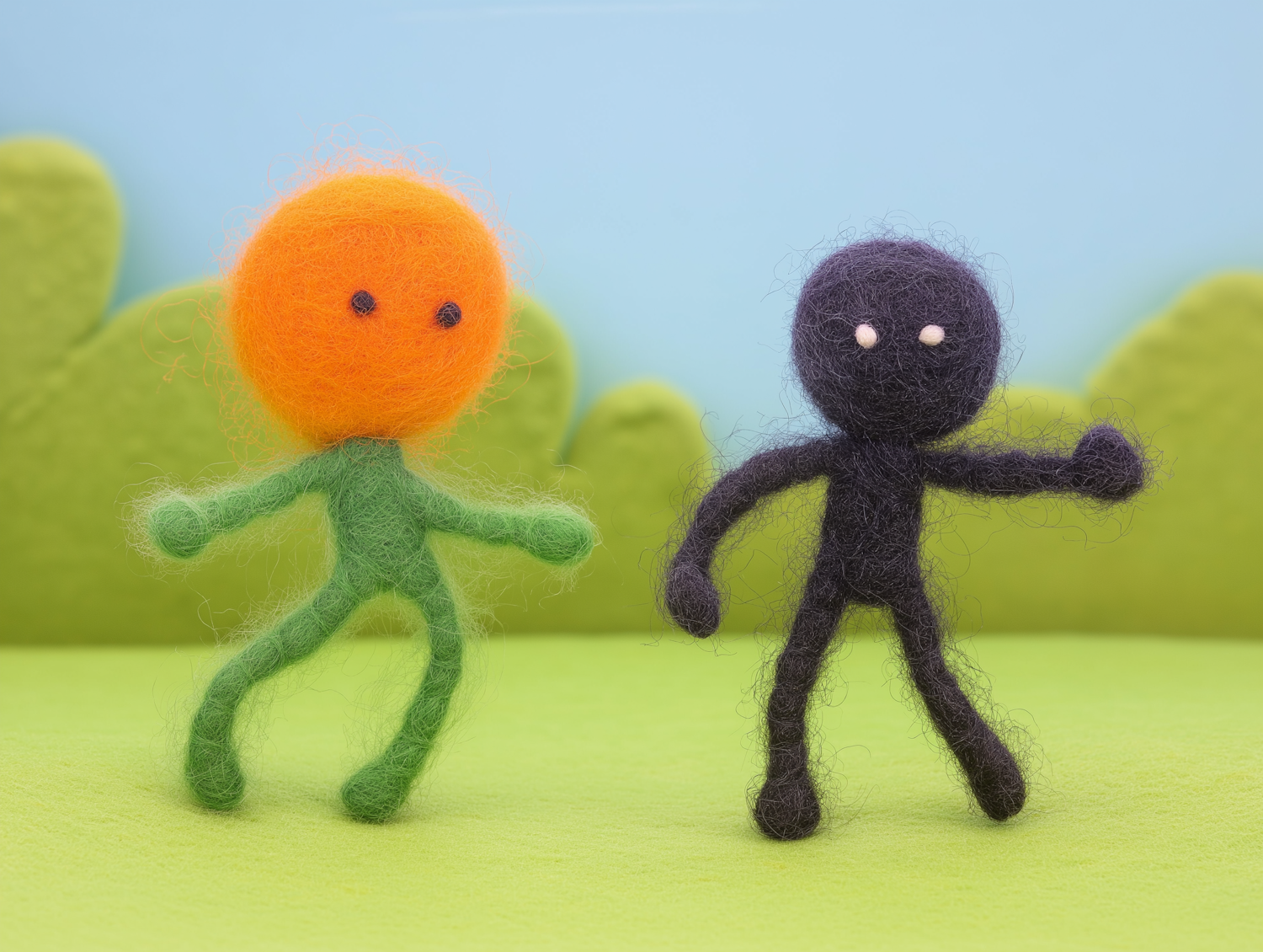Whimsical felt figures with vibrant colors stand on a soft green surface, set against a cartoonish backdrop of hills and sky.