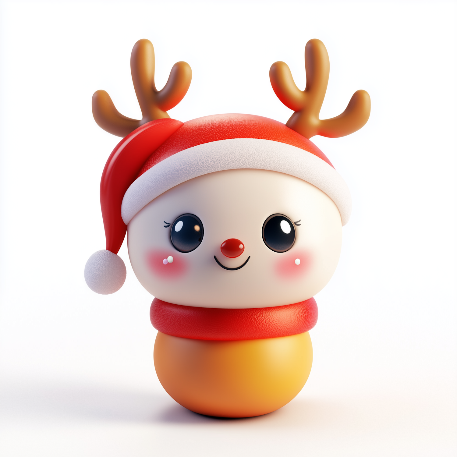Adorable cartoon reindeer with Santa hat and scarf, featuring big eyes and rosy cheeks. Perfect for festive holiday themes.