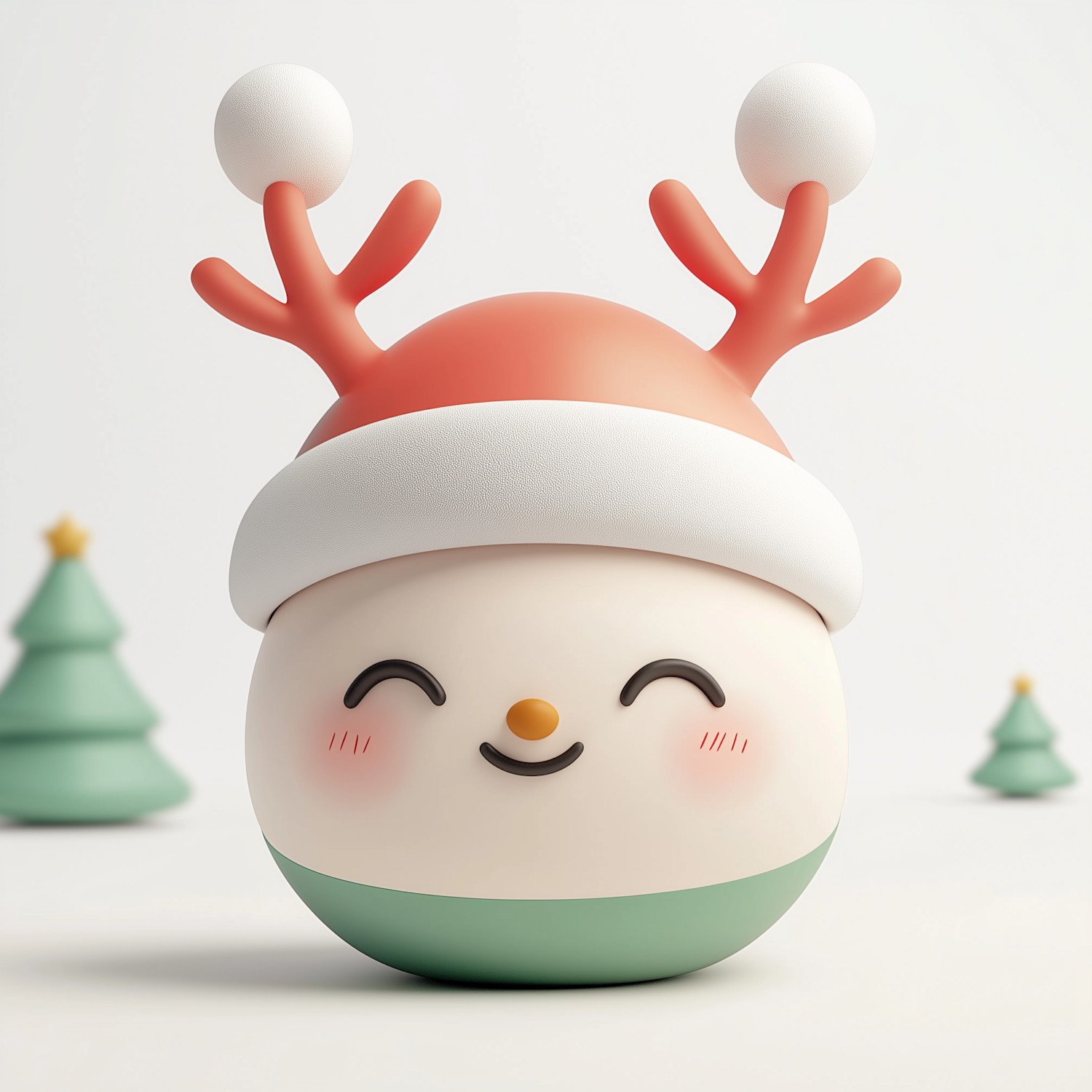 Adorable round character with Santa hat and antlers, smiling joyfully. Minimalistic Christmas trees in the background enhance the festive vibe.