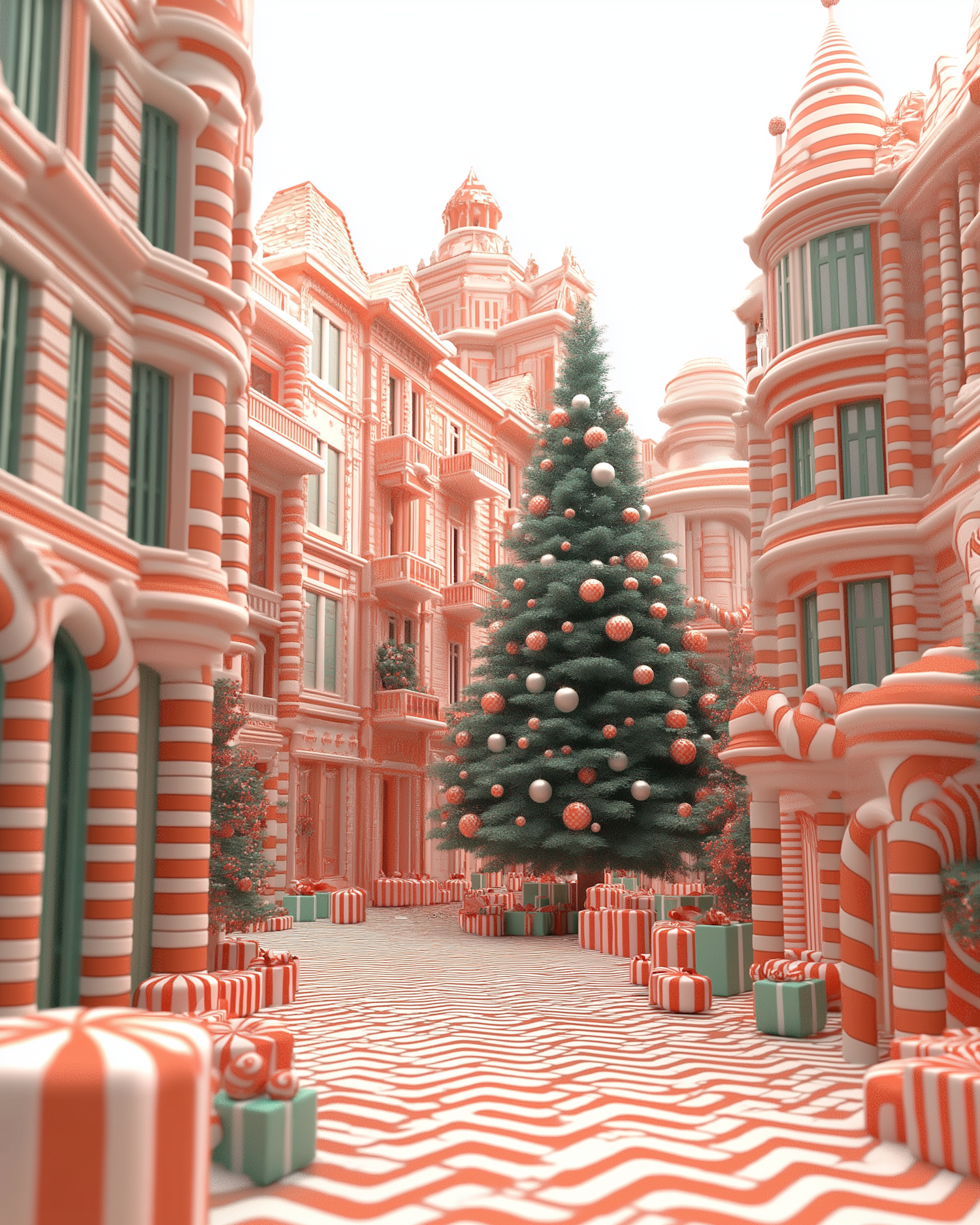 Festive street with candy cane buildings, a decorated Christmas tree, and colorful gift boxes, creating a whimsical holiday scene.