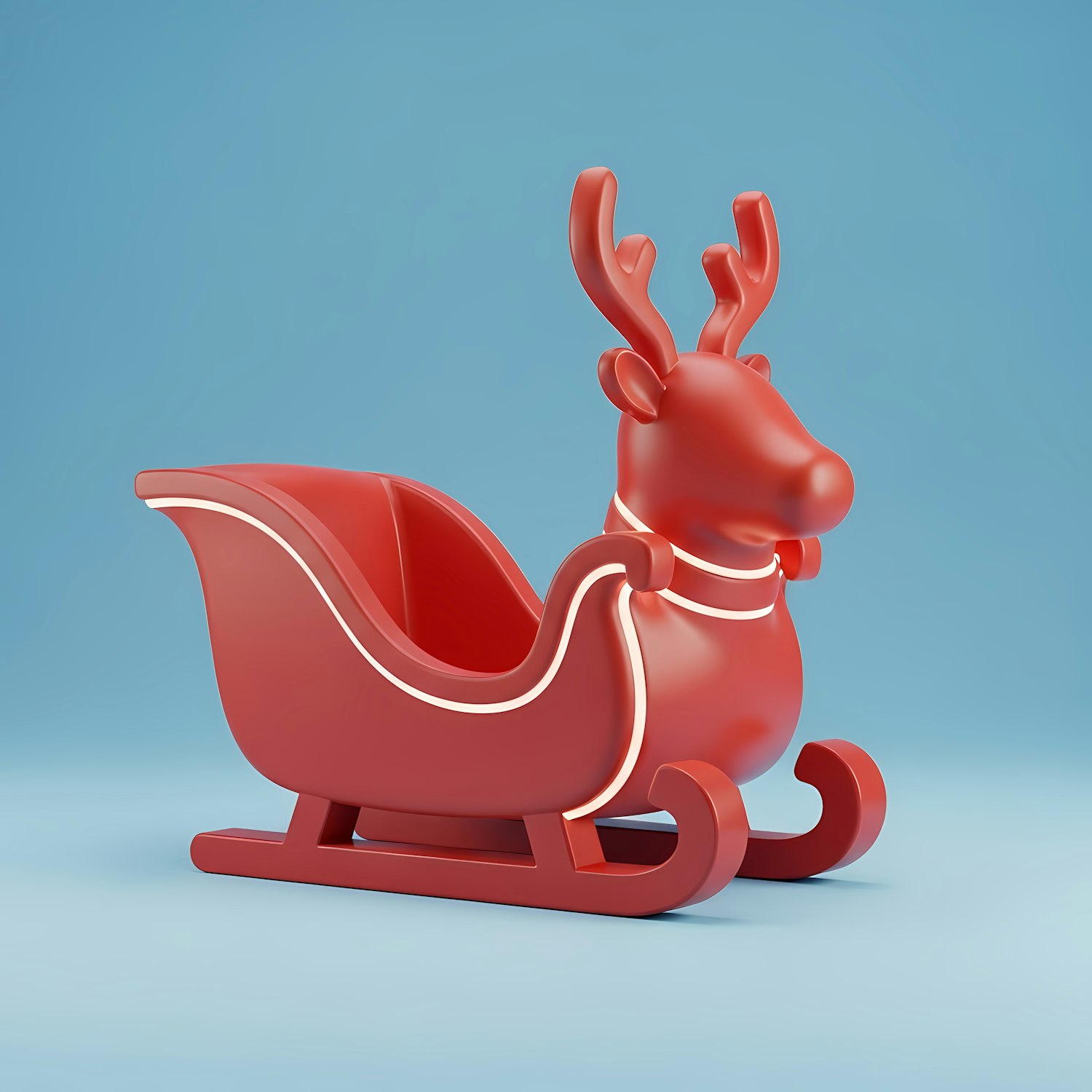 Festive 3D red sleigh with a reindeer figure, perfect for holiday-themed designs or decorations. Bright and cheerful!