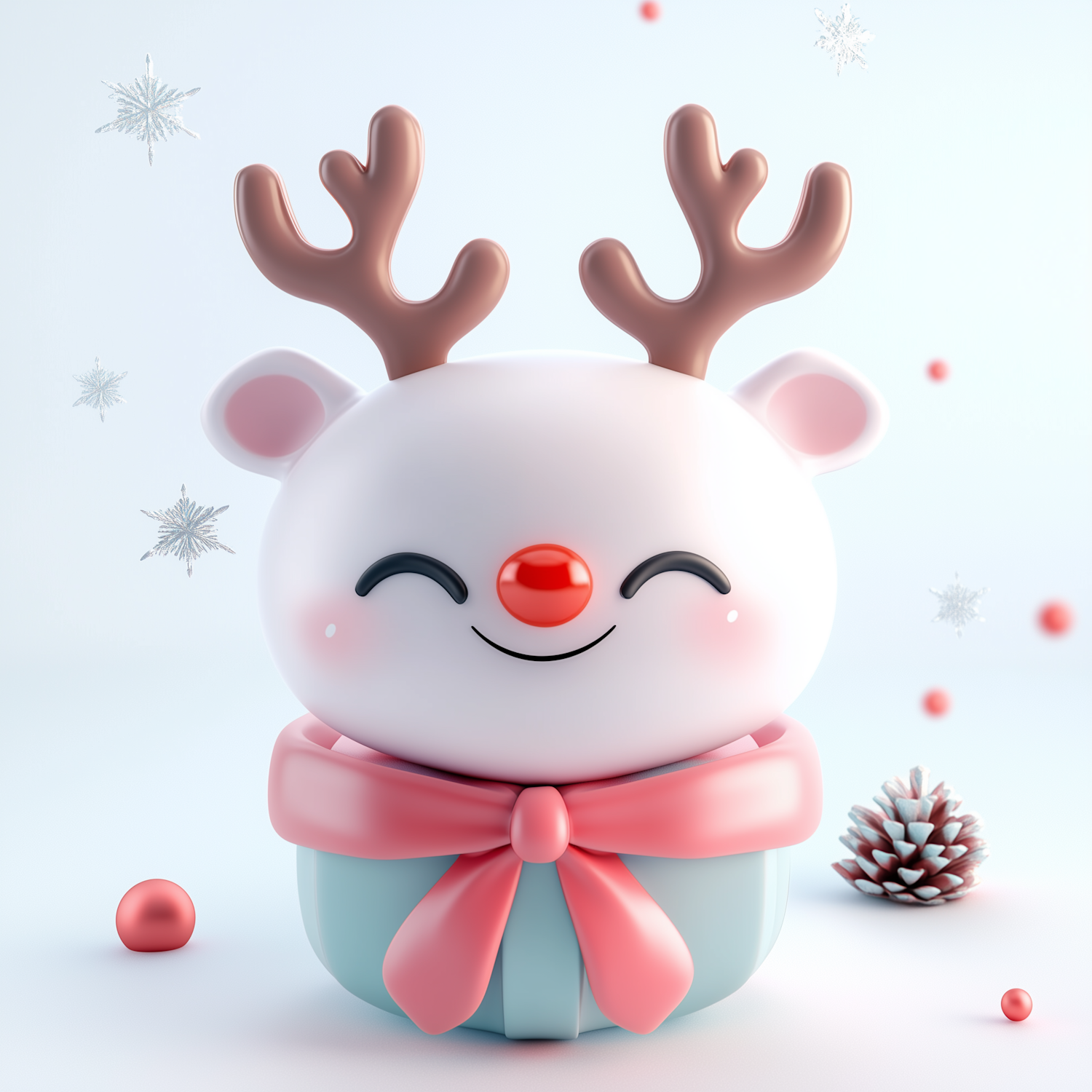 Adorable 3D reindeer illustration with a red nose, pink bow, and festive snowflakes, perfect for holiday-themed designs.
