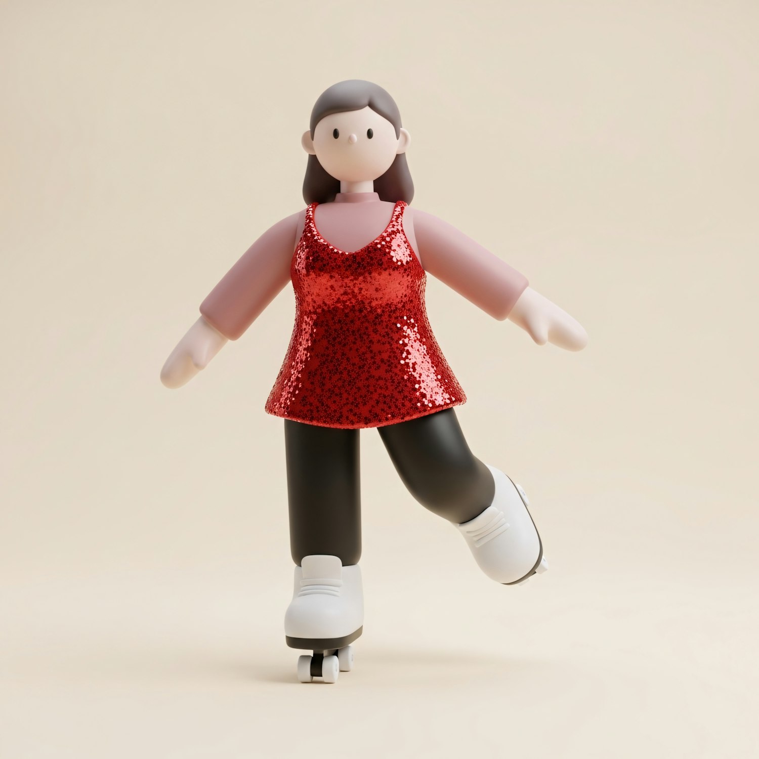 A charming 3D illustration of a figure skater in a red sequined dress and white skates, set against a neutral background.