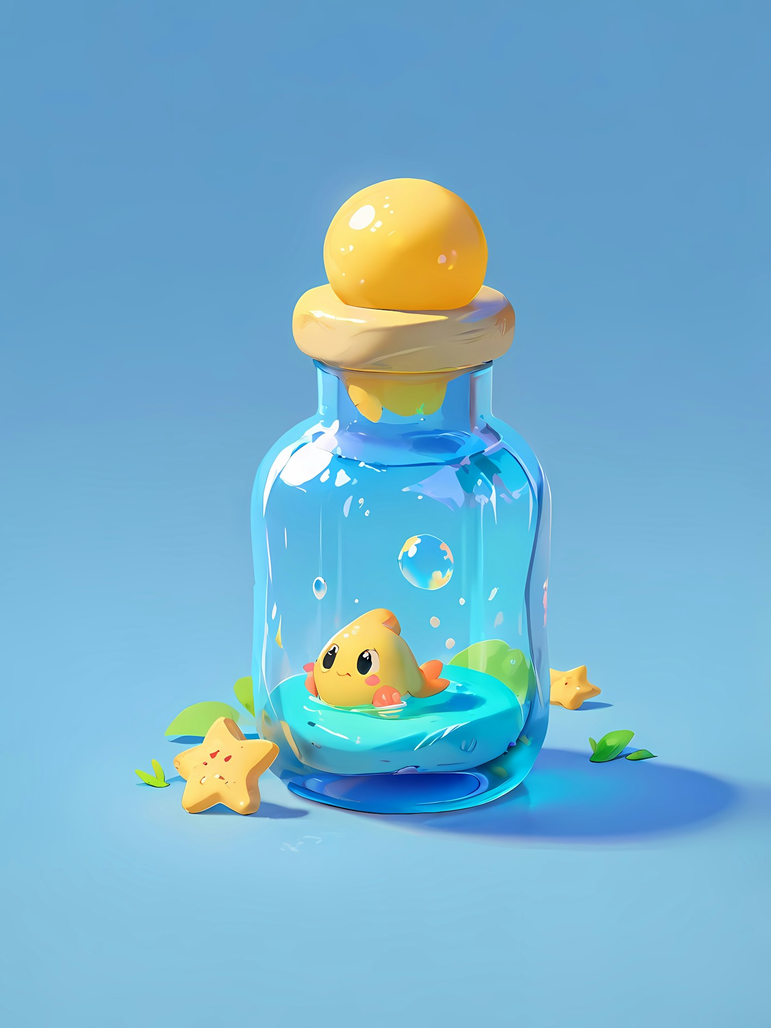 Adorable yellow fish in a glass bottle with blue water, surrounded by star-shaped cookies and leaves on a vibrant blue background.