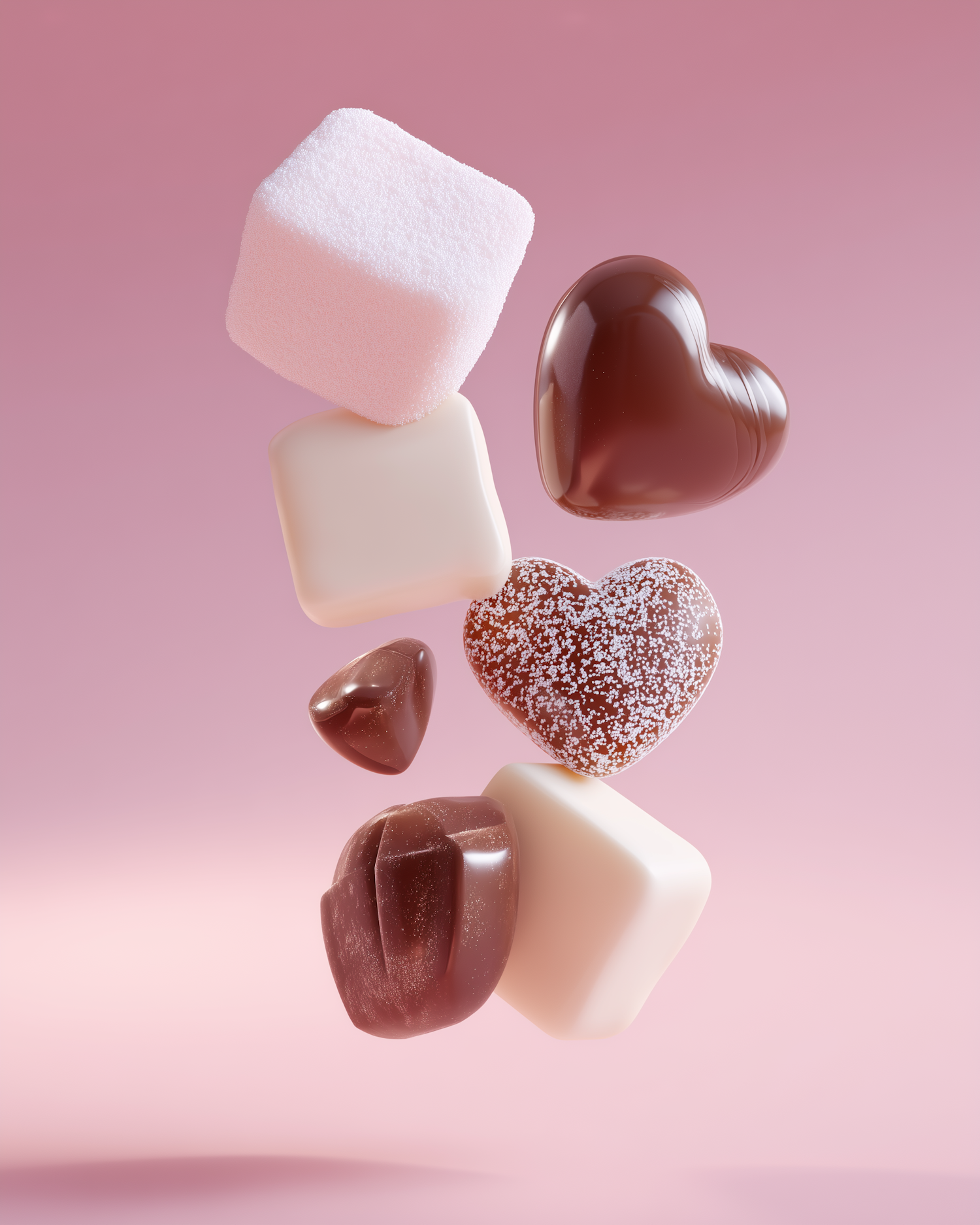 Floating chocolates and candies in heart shapes and pastel colors on a pink background, creating a whimsical and sweet visual.