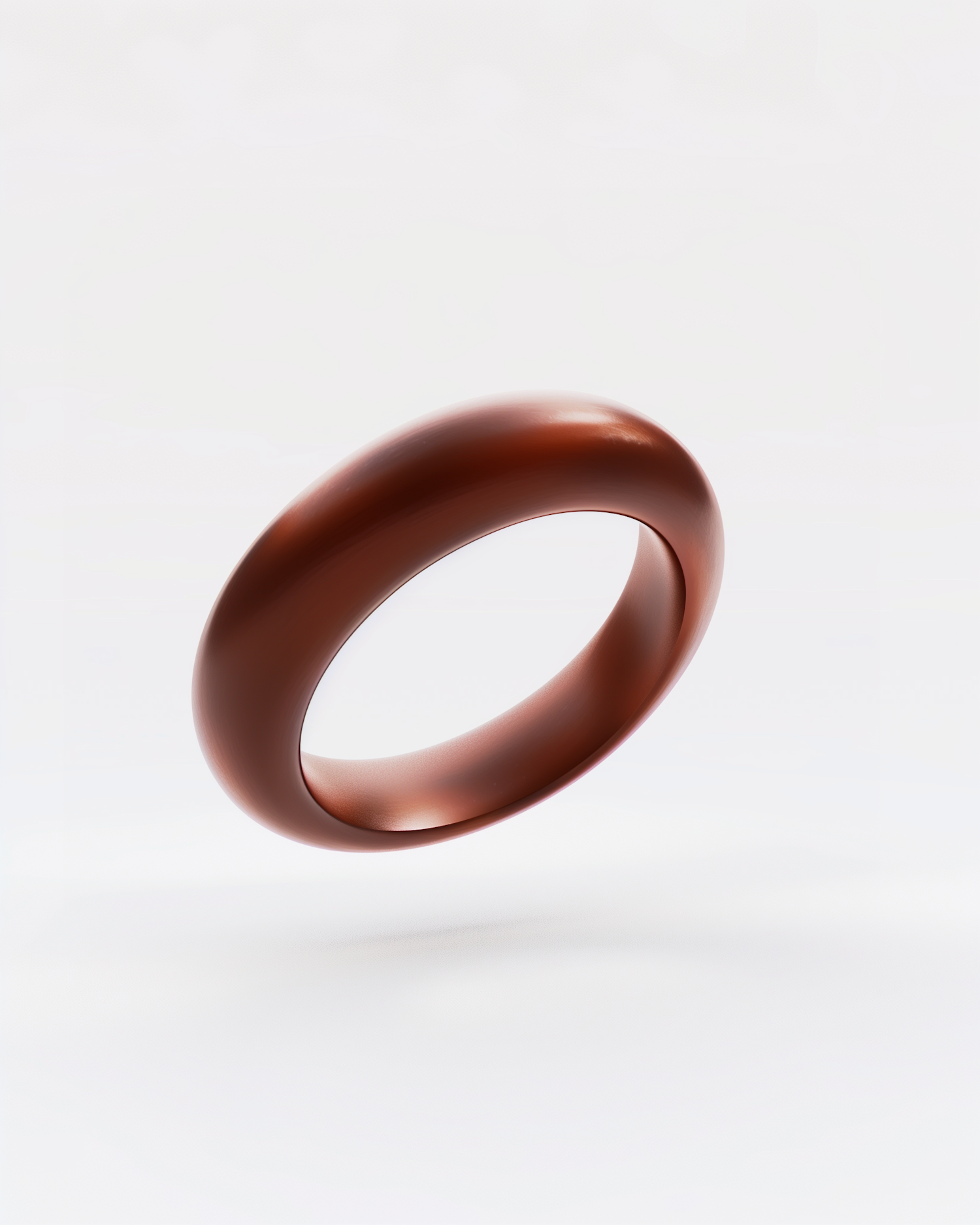 Elegant copper ring with a polished finish floating against a soft, light background, showcasing minimalist design and symmetry.