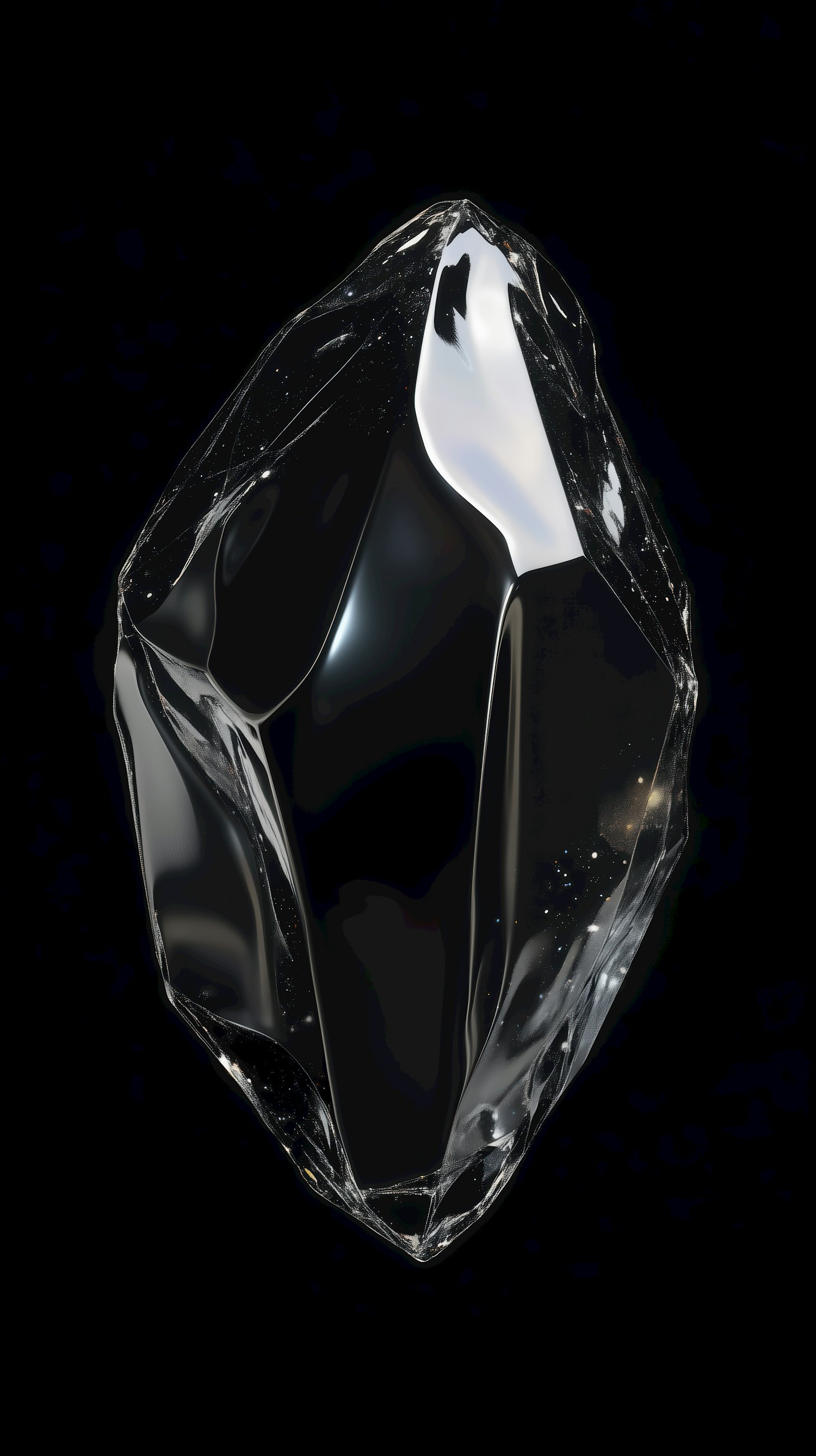 A stunning transparent crystal with sharp edges and reflective highlights, floating against a black background. Sleek and modern design.